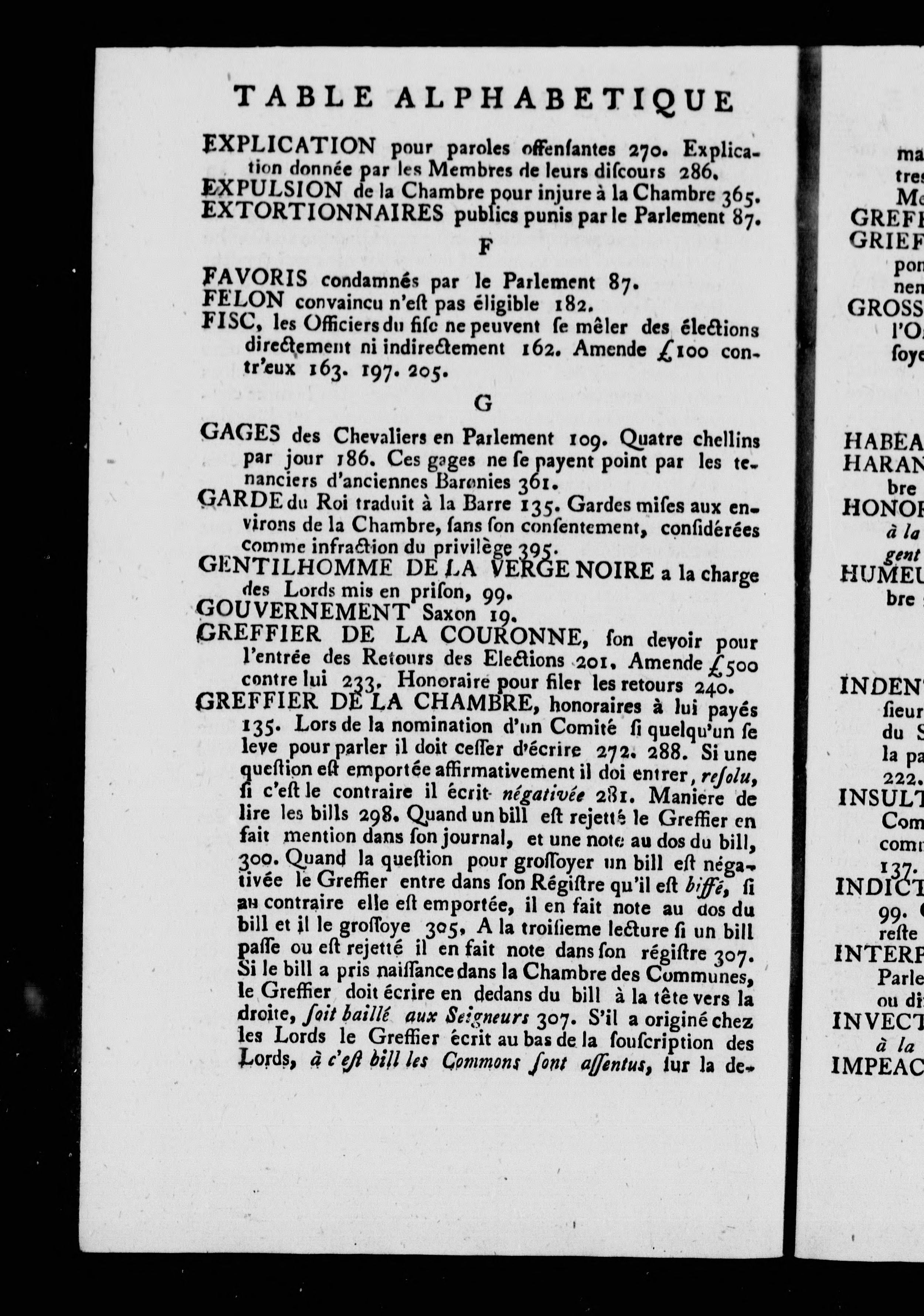 Lex parliamentaria ou Traité de la loi et coutume des parlements : montrant leur antiquité, noms, especes et qualités des trois états, et de la dignité & excellence des parlements, leur pouvoir et autorité; de l'election des membres de la Chambre des communes en géné ral, leurs privileges, qualifications et devoirs; des electeurs, leurs droits, devoirs et le mode d'élections; des retours en parlements, le devoir des shériffs et autres officiers à cet égard; de la maniere d'élire l'orateur, sa charge et son devoir; de la maniere de passer les bills, et les regles à observer dans la Chambre des communes; des sessions du parlement de sa prorogation et des ajournements, ensemble des propres loix et coutumes des parlements : avec le rapport d'un cas en Parlement entre Sir Francis Goodwyn et Sir John Fortescue, chevaliers du Comté de Bucks, 1. Jac. I.