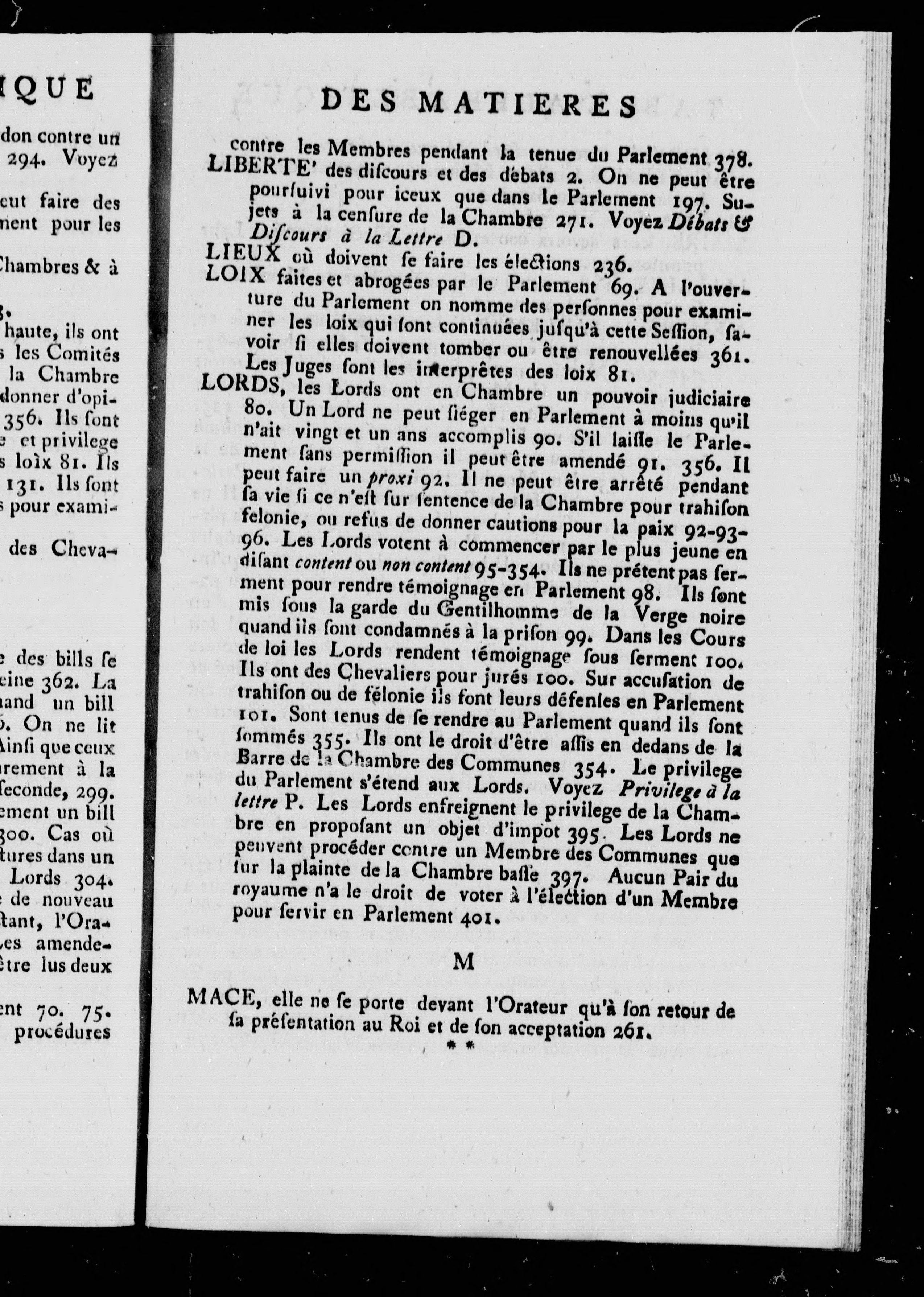 Lex parliamentaria ou Traité de la loi et coutume des parlements : montrant leur antiquité, noms, especes et qualités des trois états, et de la dignité & excellence des parlements, leur pouvoir et autorité; de l'election des membres de la Chambre des communes en géné ral, leurs privileges, qualifications et devoirs; des electeurs, leurs droits, devoirs et le mode d'élections; des retours en parlements, le devoir des shériffs et autres officiers à cet égard; de la maniere d'élire l'orateur, sa charge et son devoir; de la maniere de passer les bills, et les regles à observer dans la Chambre des communes; des sessions du parlement de sa prorogation et des ajournements, ensemble des propres loix et coutumes des parlements : avec le rapport d'un cas en Parlement entre Sir Francis Goodwyn et Sir John Fortescue, chevaliers du Comté de Bucks, 1. Jac. I.