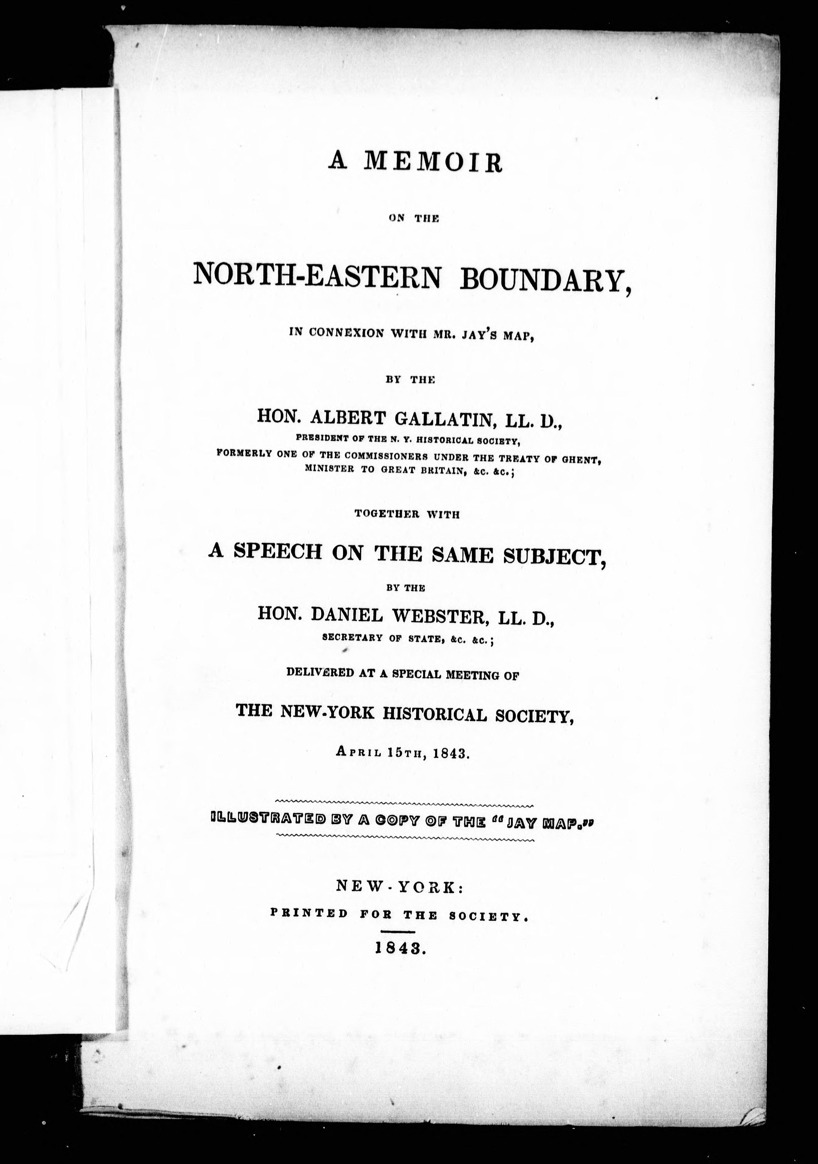 A memoir on the north-eastern boundary, in connexion with Mr. Jay' s map / by Albert Gallatin. Together with a speech on the same subject, by the Hon. Daniel Webster, LL.D., secretary of state, &c. & c., delivered at a special meeting of the New York Historical Society, April 15th, 1843.