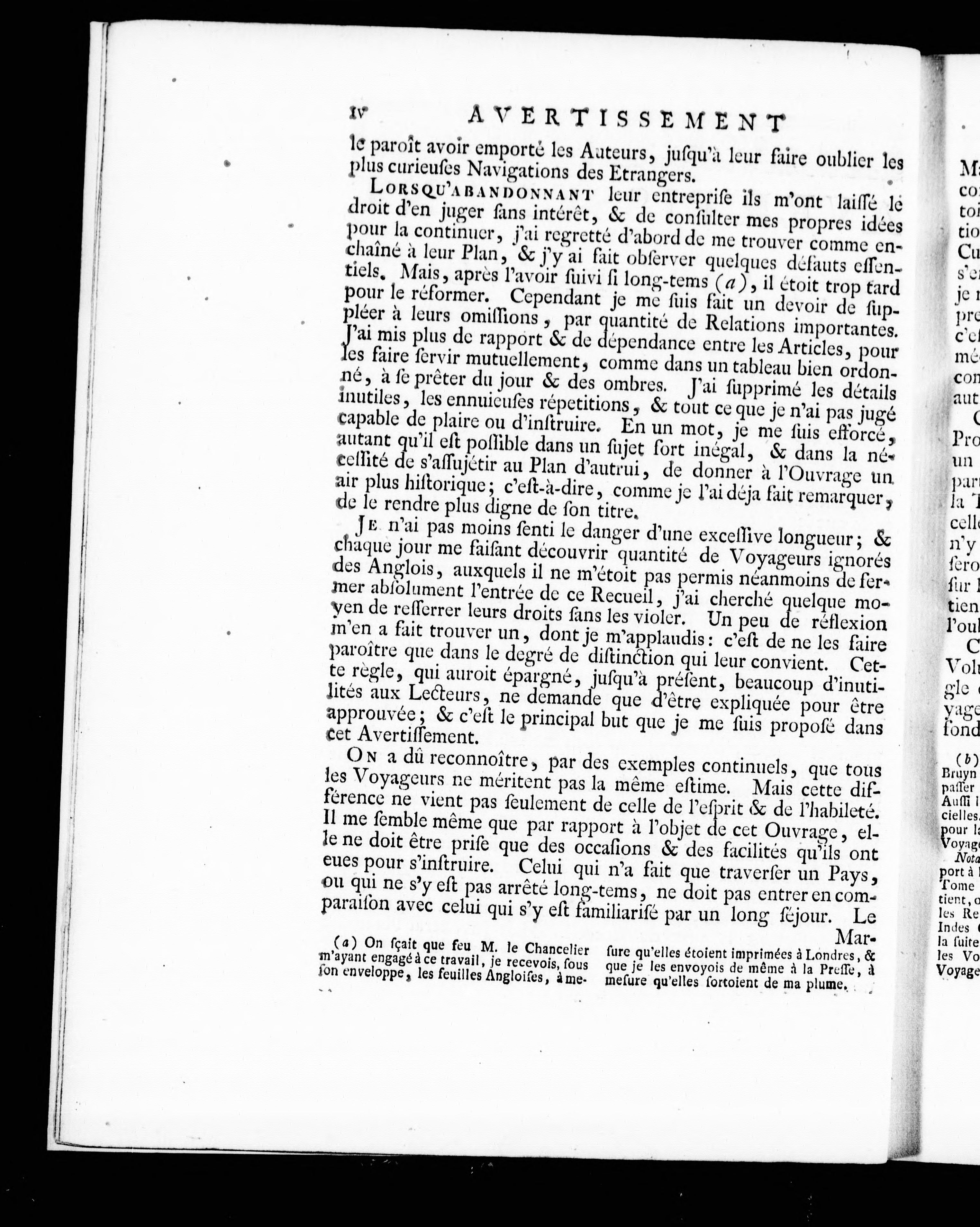 Histoire générale des voyages ou Nouvelle collection de toutes les relations de voyages par mer et par terre, qui ont été publiées jusqu'à présent dans les différentes langues de toutes les nations connues : contenant ce qu'il y a de plus remarquable, de plus utile, & de mieux avéré, dans les pays où les voyageurs ont pénétré, touchant leur situation, leur étendue, leurs limites ... : avec les moeurs et les usages des habitans ... : pour former un systême complet d'histoire et de géographie moderne, qui représentera l'état actuel de toutes les nations : enrichie de cartes géographiques nouvellement composé es sur les observations les plus authentiques ; de plans et de perspectives, de figures d'animaux, de végétaux, habits, antiquités, &c.