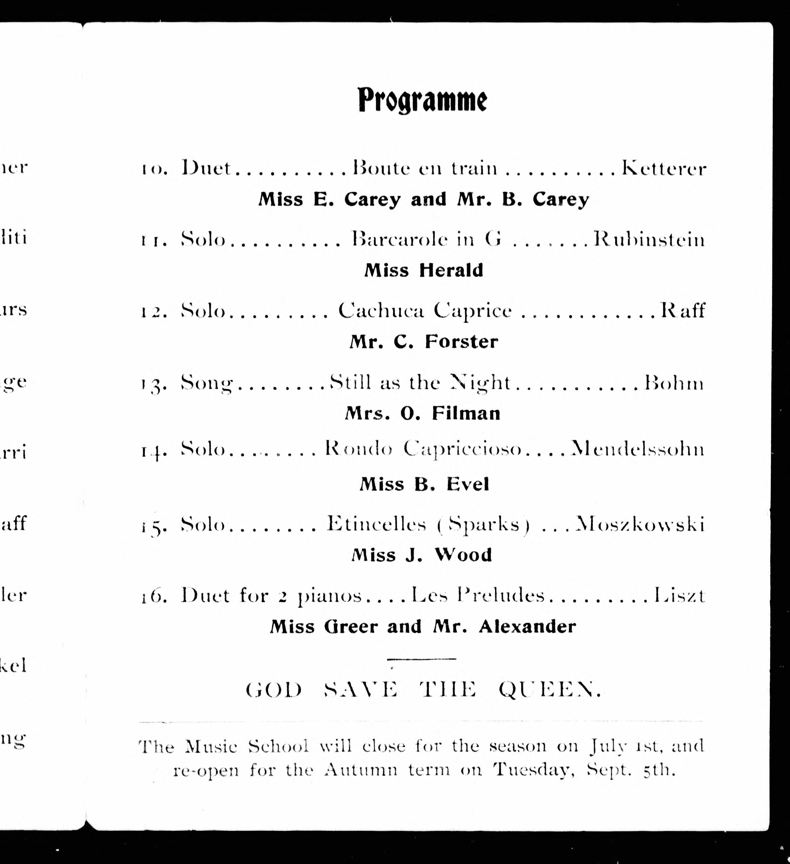 - Hamilton Music School, annual summer concert : to be held in the Central Presbyterian Schoolroom, Jackson Street West : Thursday, June 29, 1899.