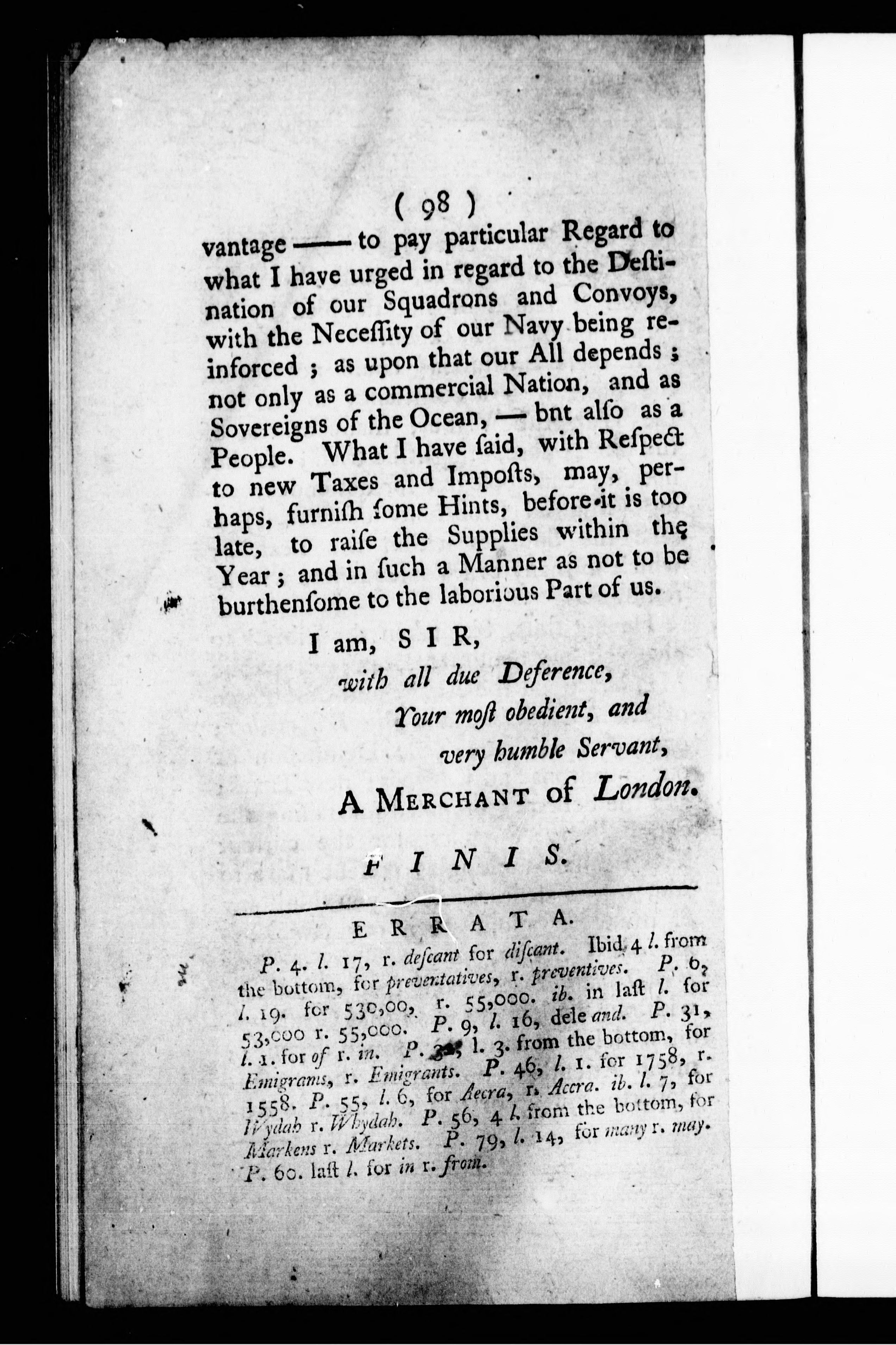 - A letter from a merchant of the city of London, to the R---t H----ble W----P----Esq. : upon the affairs and commerce of North America, and the West-Indies; our African trade; the destination of our squadrons and convoys; new taxes, and the schemes proposed for raising the extraordinary supplies for the current year