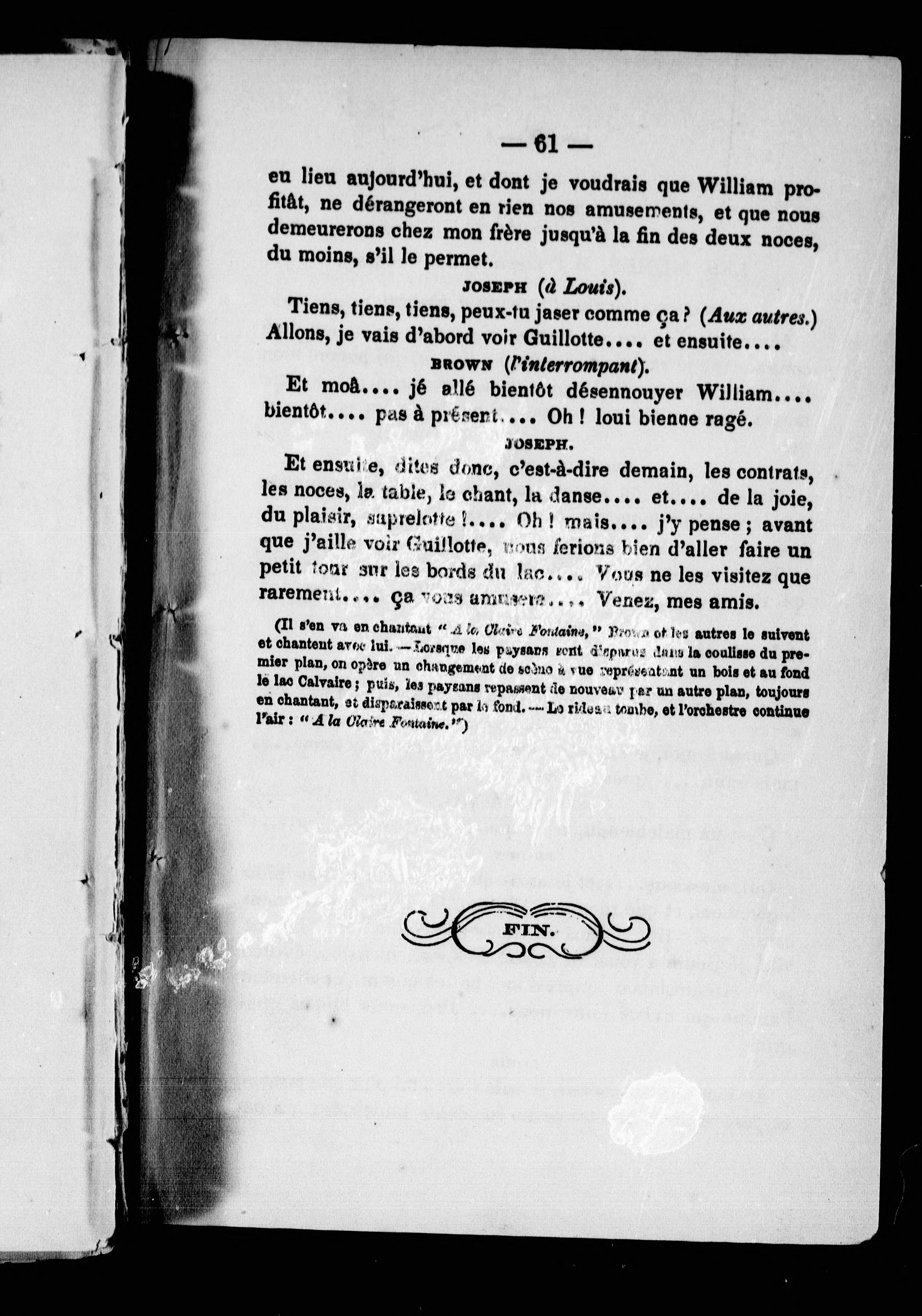 "Représentée pour la première fois à Québec, par les Amateurs Canadiens-Français le 22 avril 1857, et par les Jeunes Amateurs Canadiens, le 28 avril 1860."