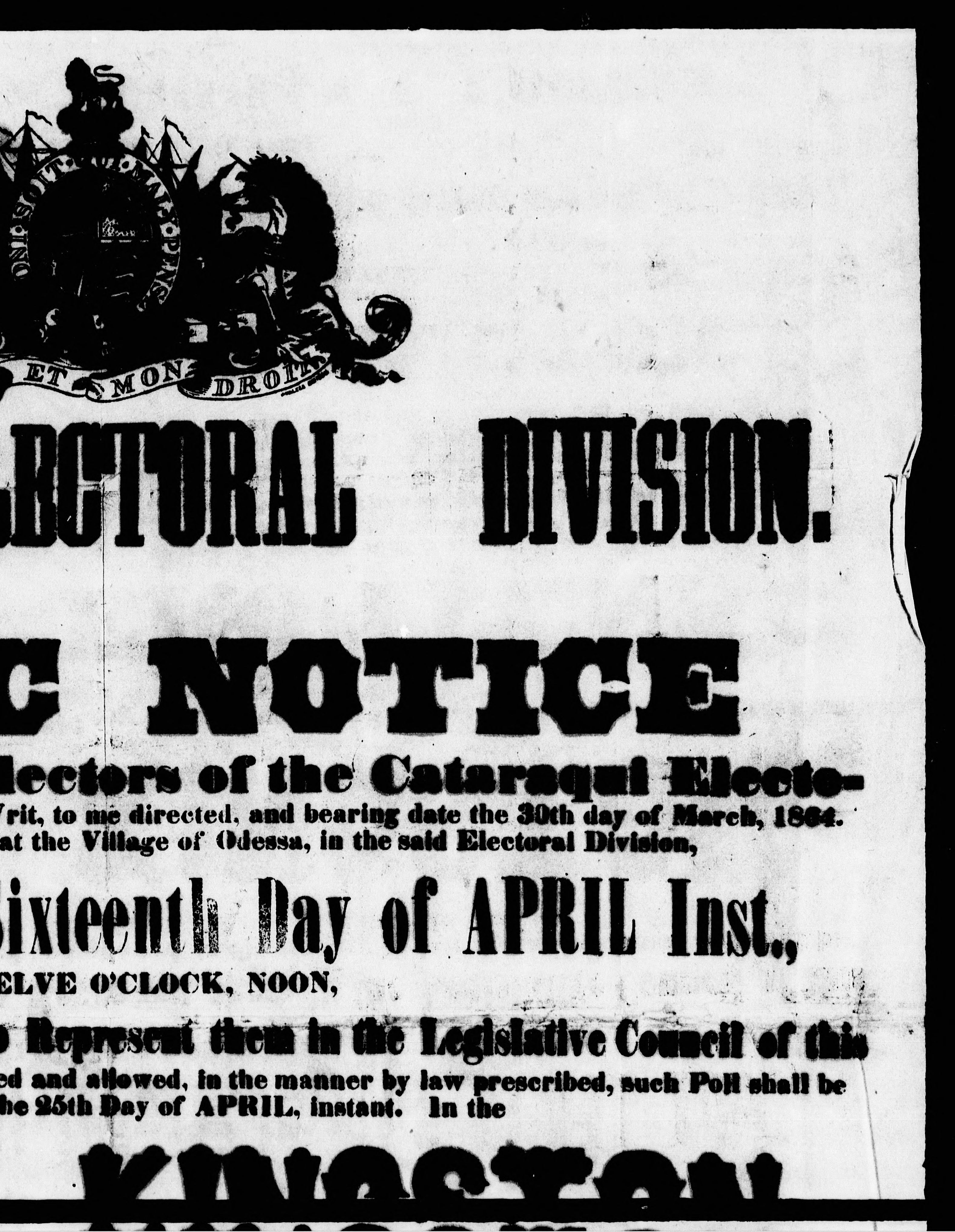 - Cataraqui electoral division : to wit: public notice is hereby given to the electors of the Cataraqui electoral division, that in obedience to Her Majesty's writ, to me directed, and bearing date the 30th day of March, 1864 ... for the purpose of electing a person to represent them in the Legislative Council ... in the city of Kingston ..