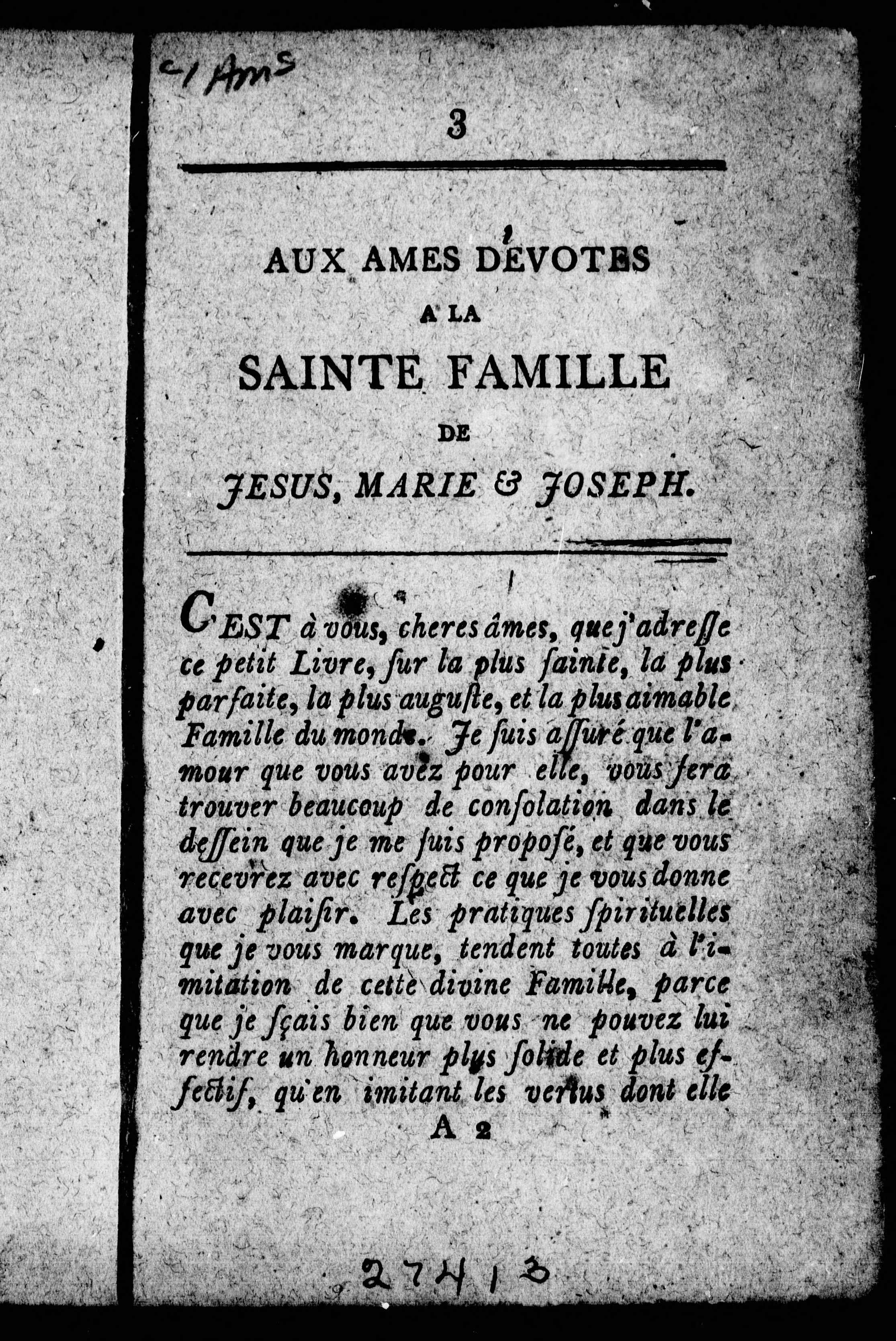 Comprend: Instruction sur l'etablissement de la sainte famille de Jesus, Marie and Joseph, en Canada, environ l'an 1650.