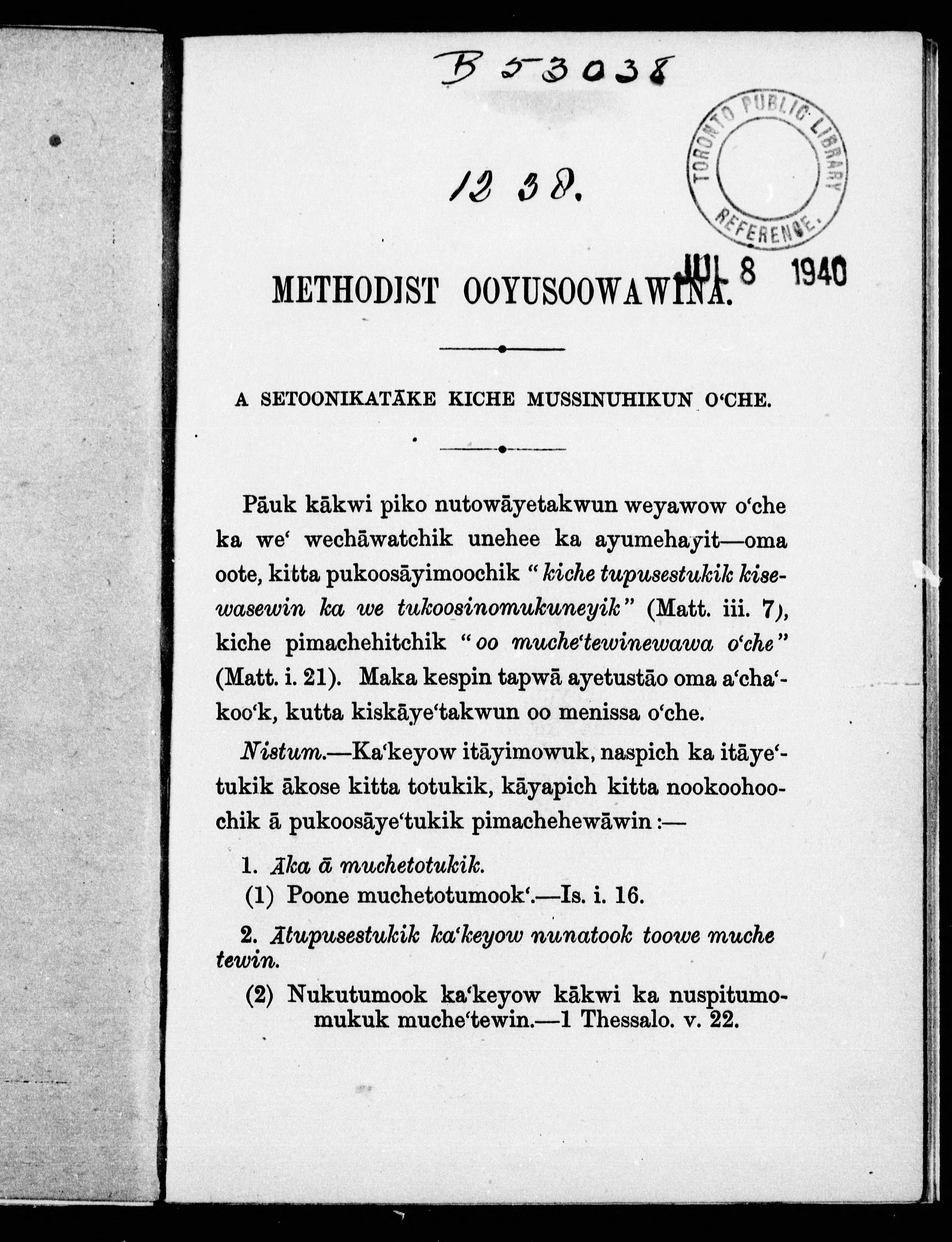 - Methodist ooyusoowāwina : ā setoonikatake kiche mussinuhikun o'che.