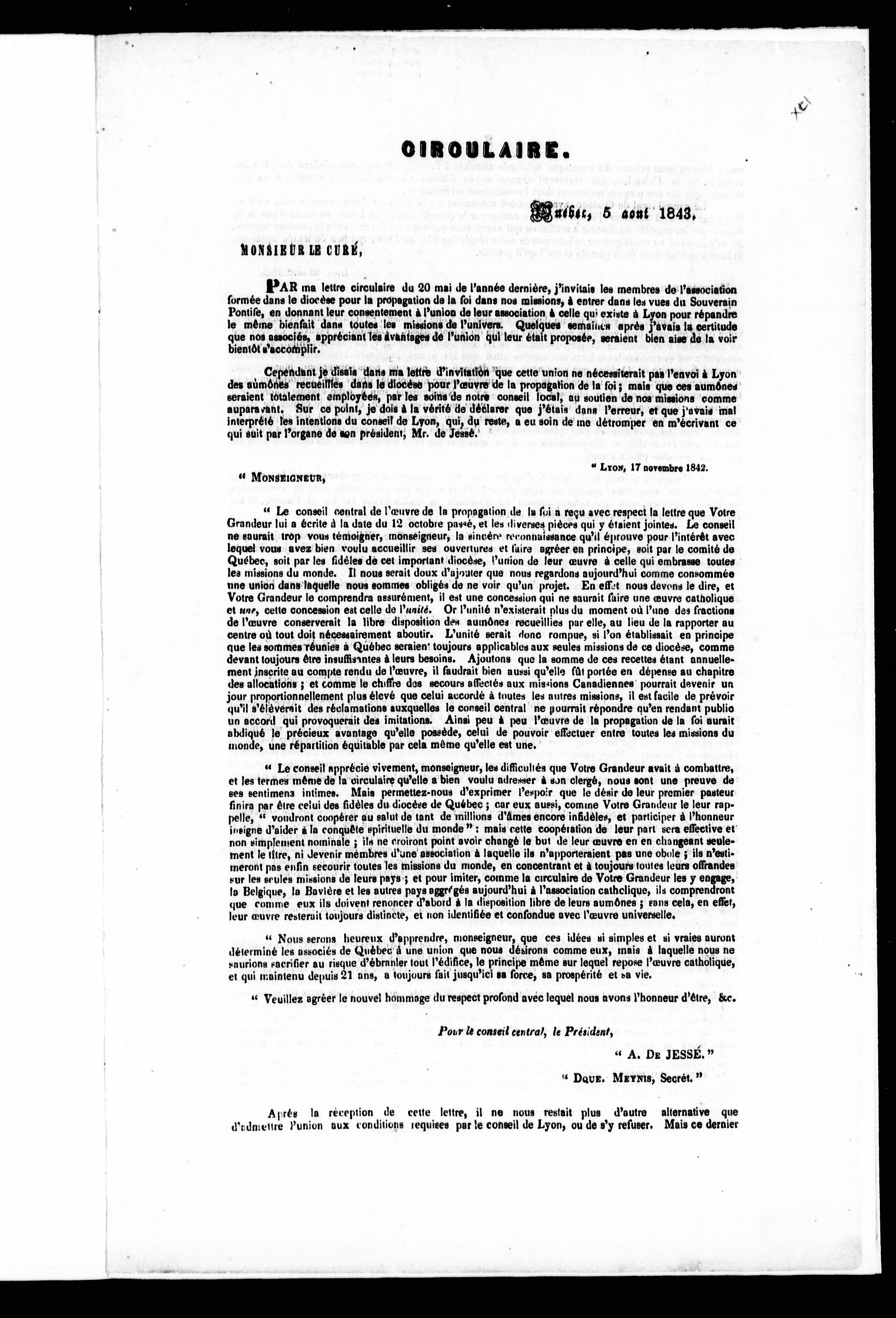 Circulaire : par ma lettre circulaire du 20 mai de l'année dernière, j'invitais les membres de l'association formée dans le diocèse pour la propagation de la foi dans nos missions ..
