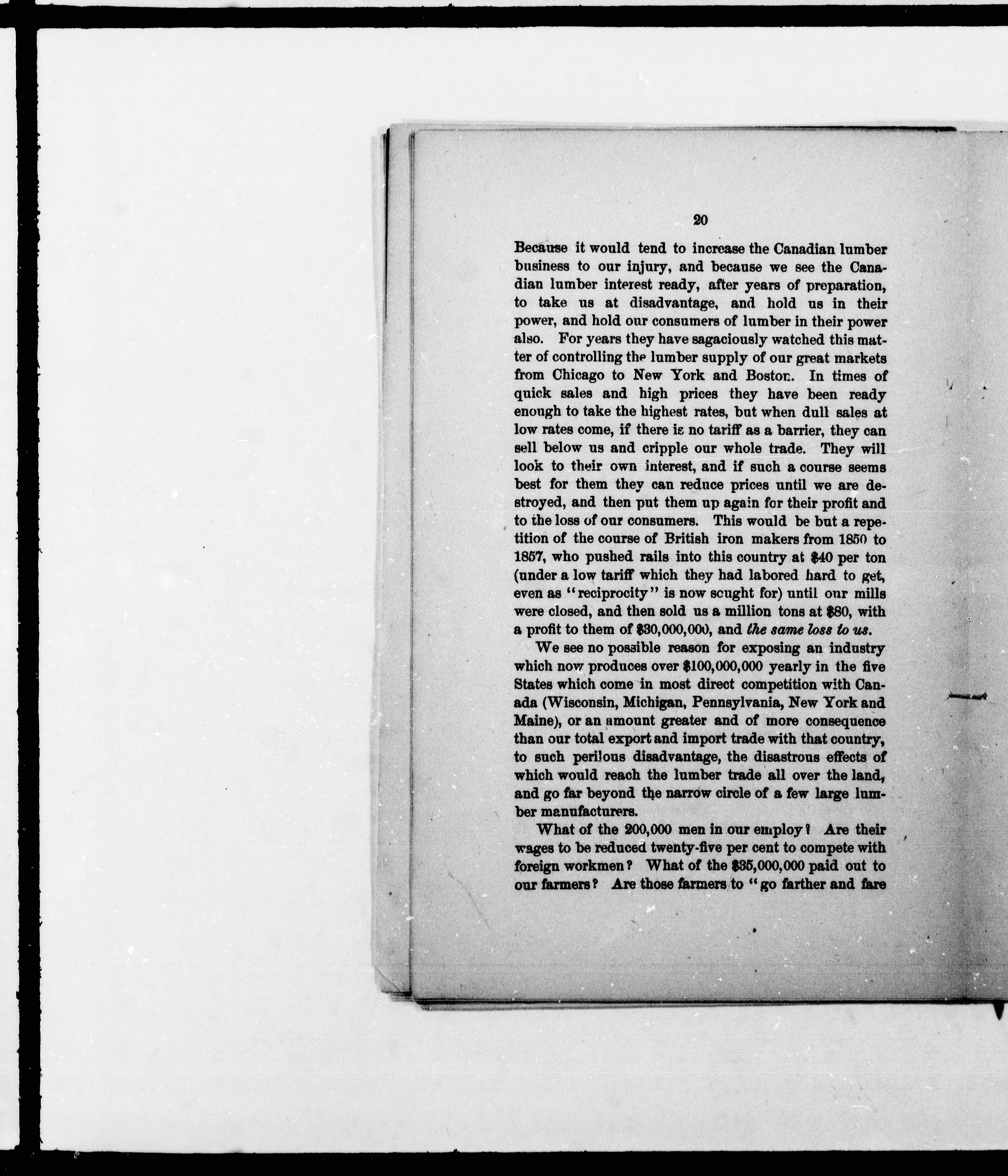 Memorial and remonstrance to the Congress of the United States at Washington D.C. from the National Association of Lumbermen : against the so-called "Reciprocity Treaty" between the United States and the British North American provinces; our lumber industry, its magnitude and importance; risks by forest fires; the Canadian lumber trade, etc., etc.