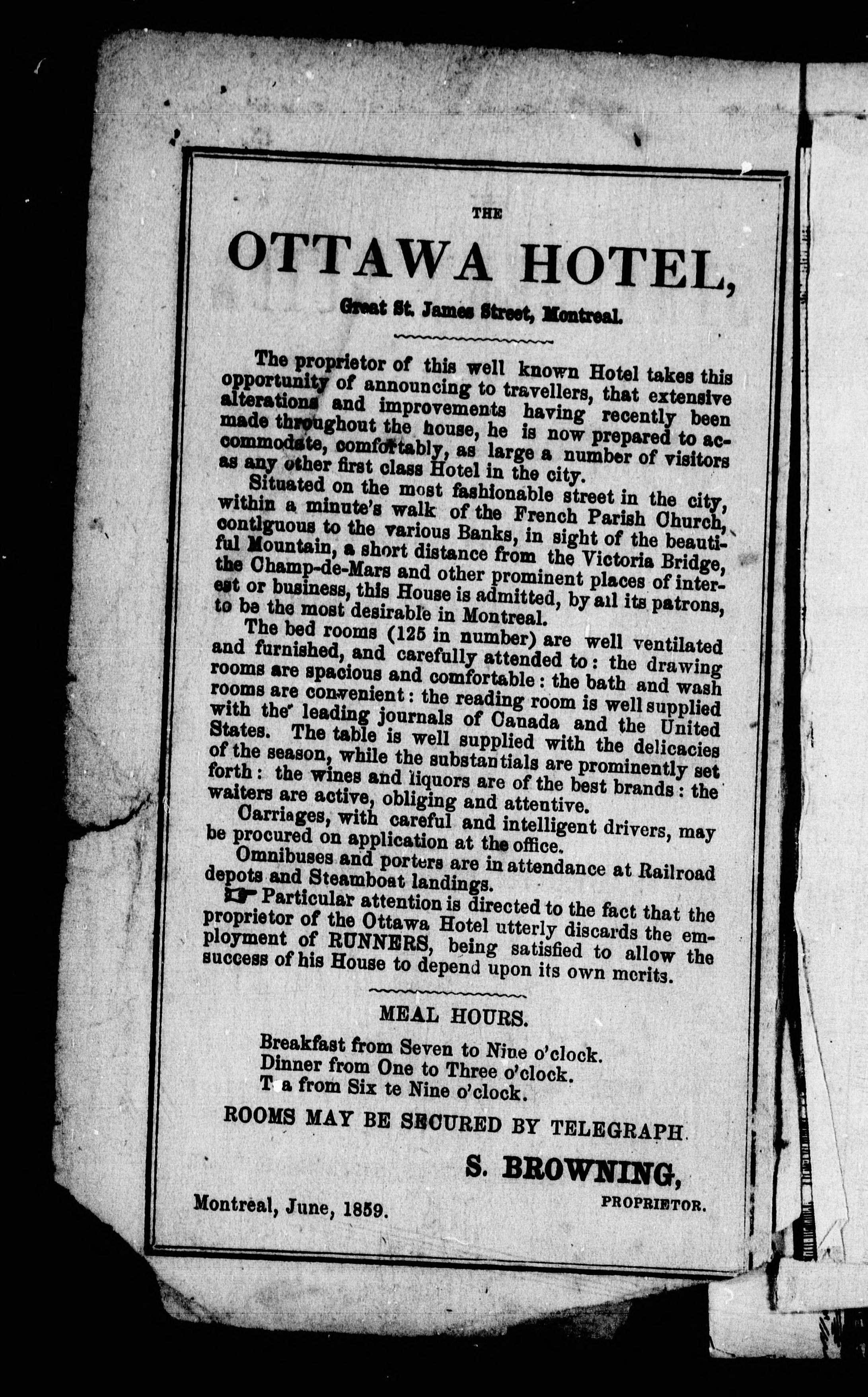 "Presented to the guests of the Ottawa Hotel by S. Browning, proprietor."