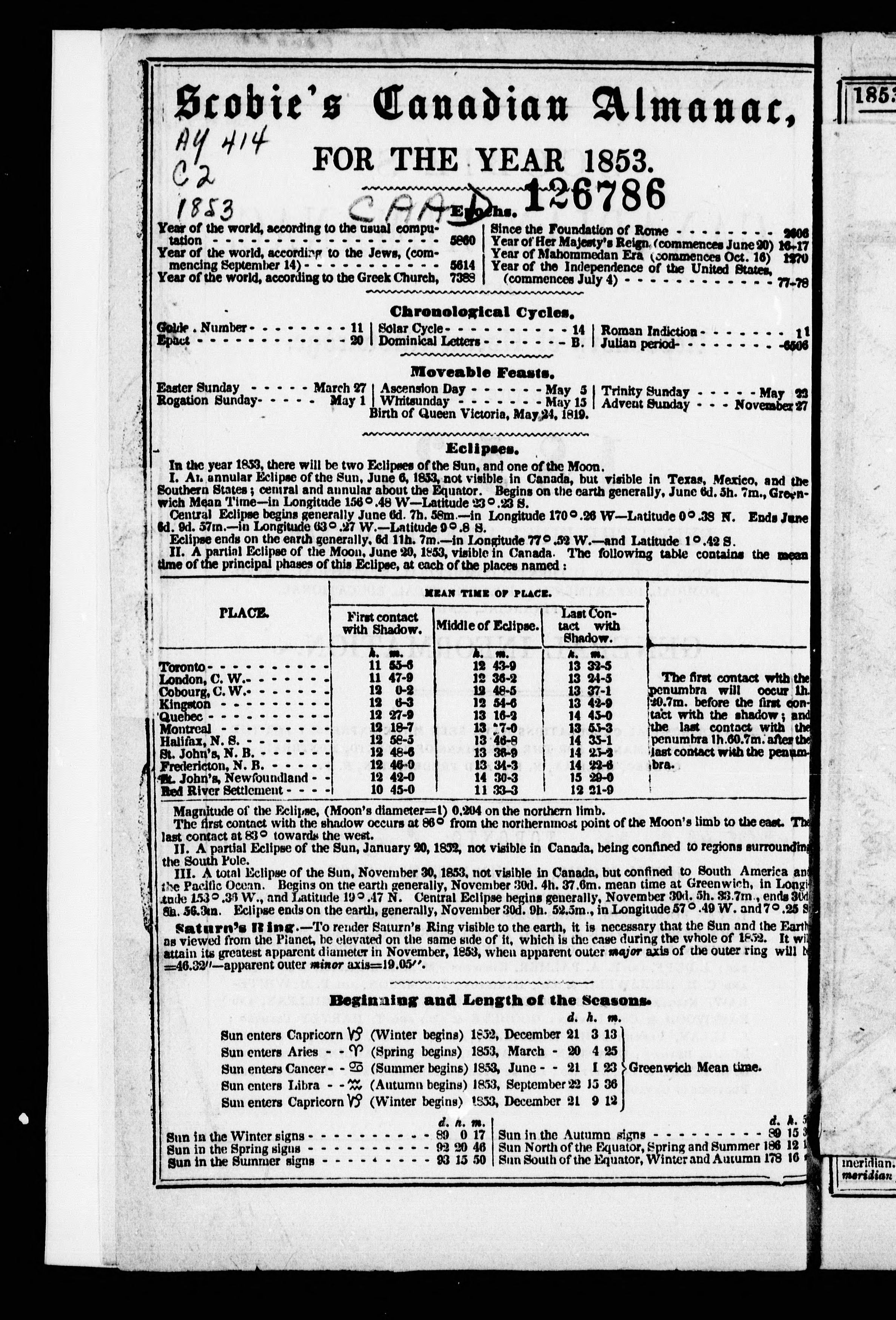 Scobie's Canadian almanac and repository of useful knowledge for the year 1853, being the first after leap year : containing full and authentic commercial, statistical, astronomical, departmental, ecclesiastical, educational, financial and general information.