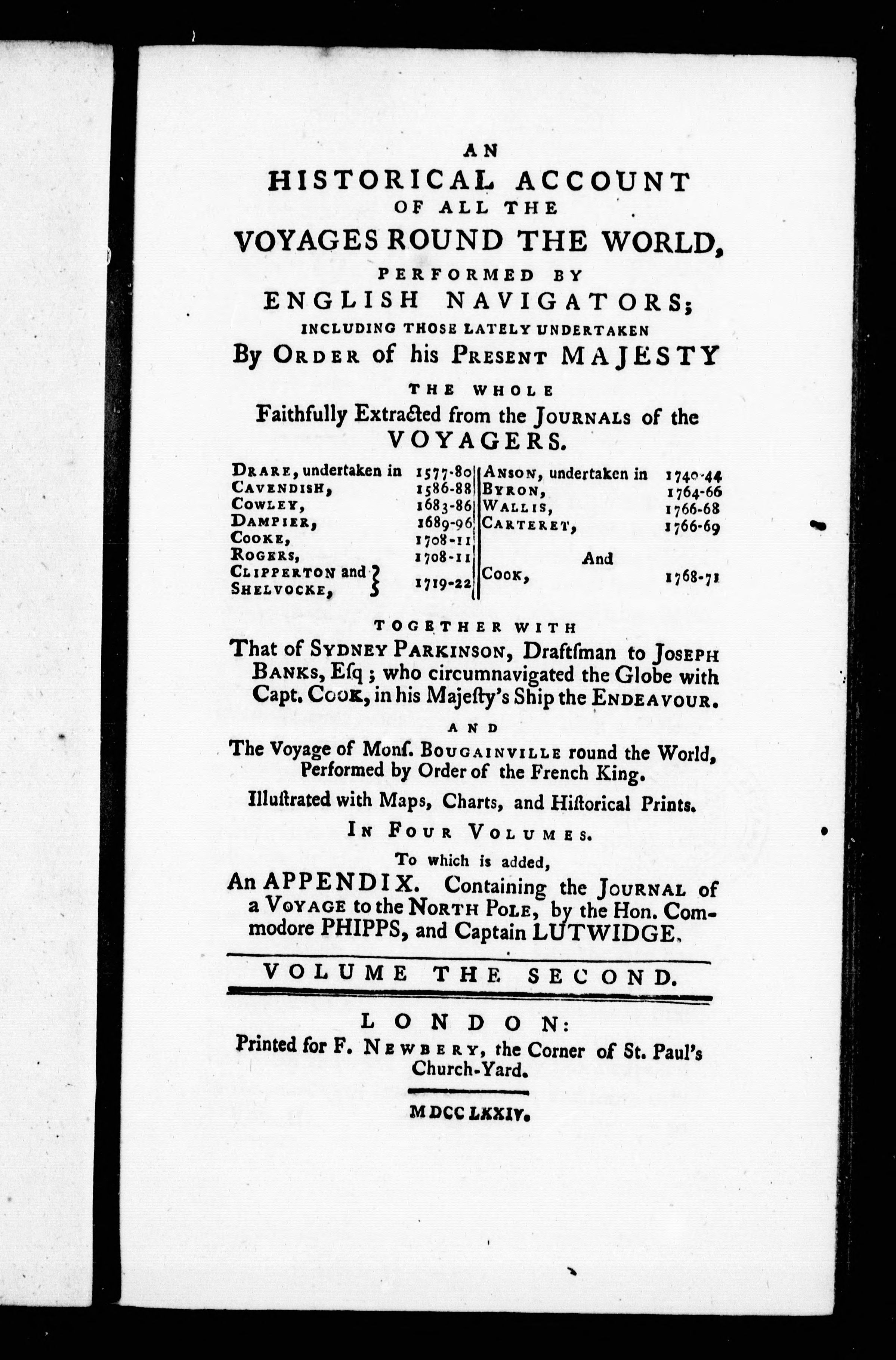 An Historical account of all the voyages round the world, performed by English navigators; including those lately undertaken by order of His Present Majesty : the whole faithfully extracted from the journals of the voyagers: Drake, undertaken in 1577-80; Cavendish, 1586-1588 ... together with that of Sydney Parkinson, draftsman to Joseph Banks, Esq. ... and the voyage of Mons. Bougainville round the world, performed by order of the French king : illustrated with maps, charts, and historical prints : in four volumes ; to which is added, an appendix, containing the journal of a voyage to the North Pole, by the Hon. Commodore Phipps, and Captain Lutwidge.