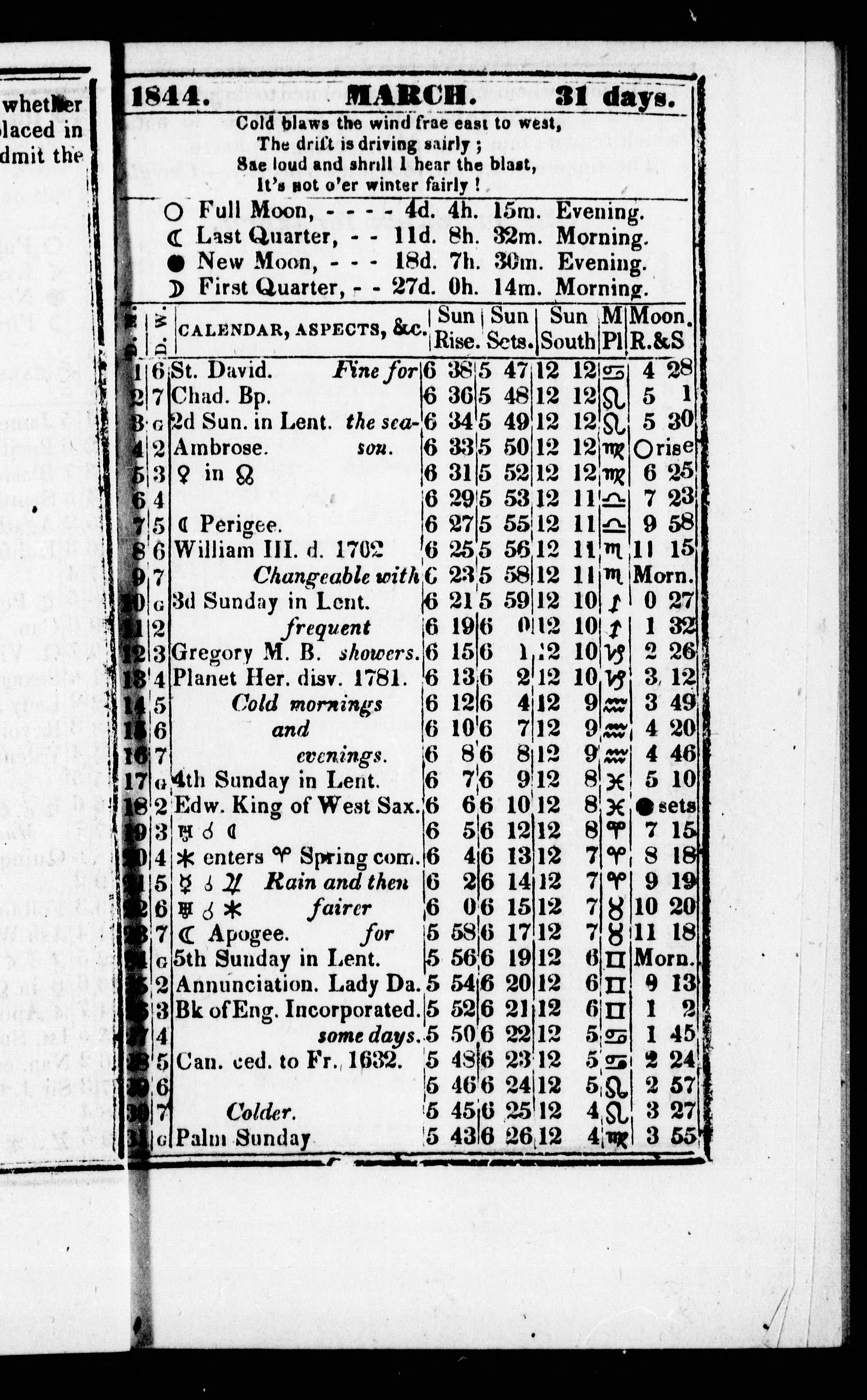 The Canadian farmers' almanac for the year of Our Lord 1844 : being bissextile or leap year, and, till the 20th day of June, the 7th year of the reign of Her Most Gracious Majesty Queen Victoria, calculated for the meridian of Sherbrooke, in latitude 45@ 25' N. and longitude 71@ 55' W. from the Royal Observatory, Greenwich, but arranged so as to serve without essential variation for every other portion of Canada