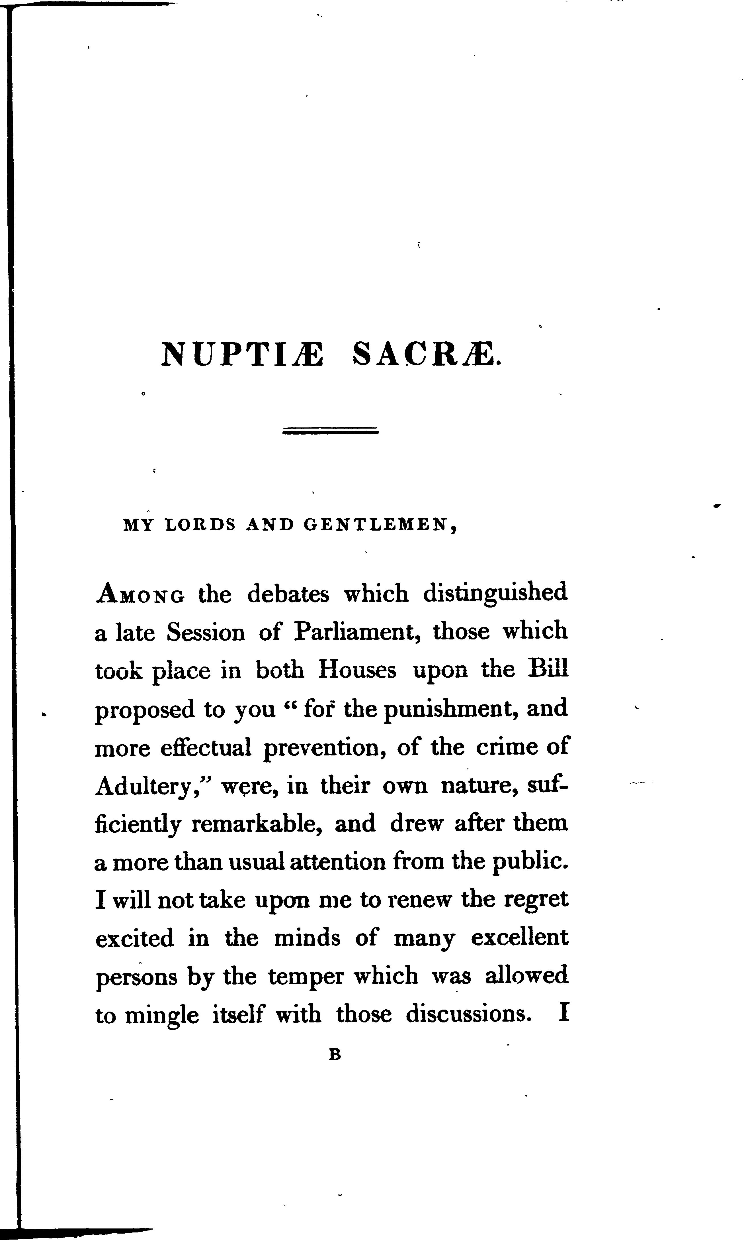 Nuptiæ sacræ, or, An inquiry into the scriptual doctrine of marriage and divorce : addressed to the two Houses of Parliament. - Published