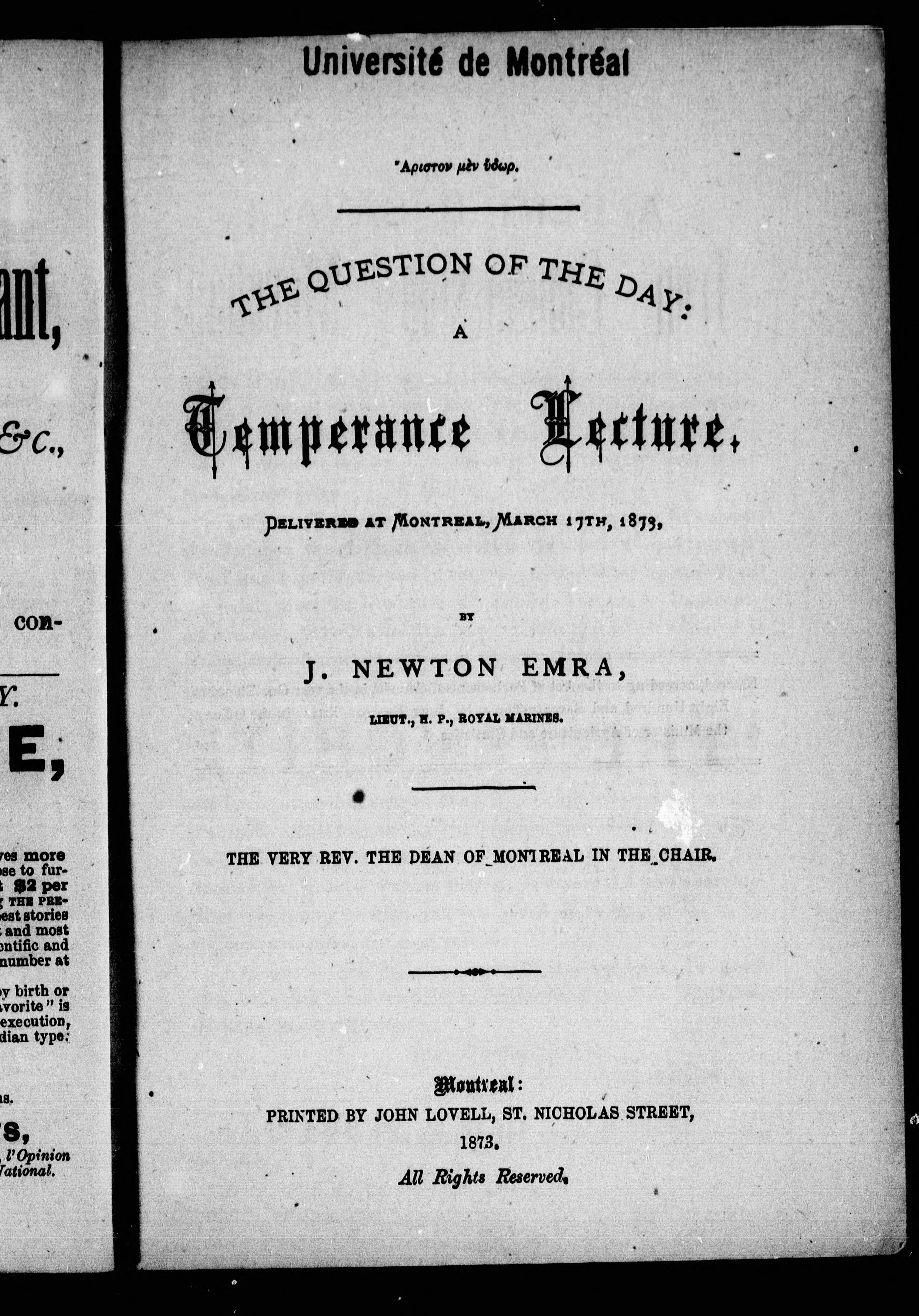- The question of the day : a temperance lecture delivered at Montreal, March 17th, 1873