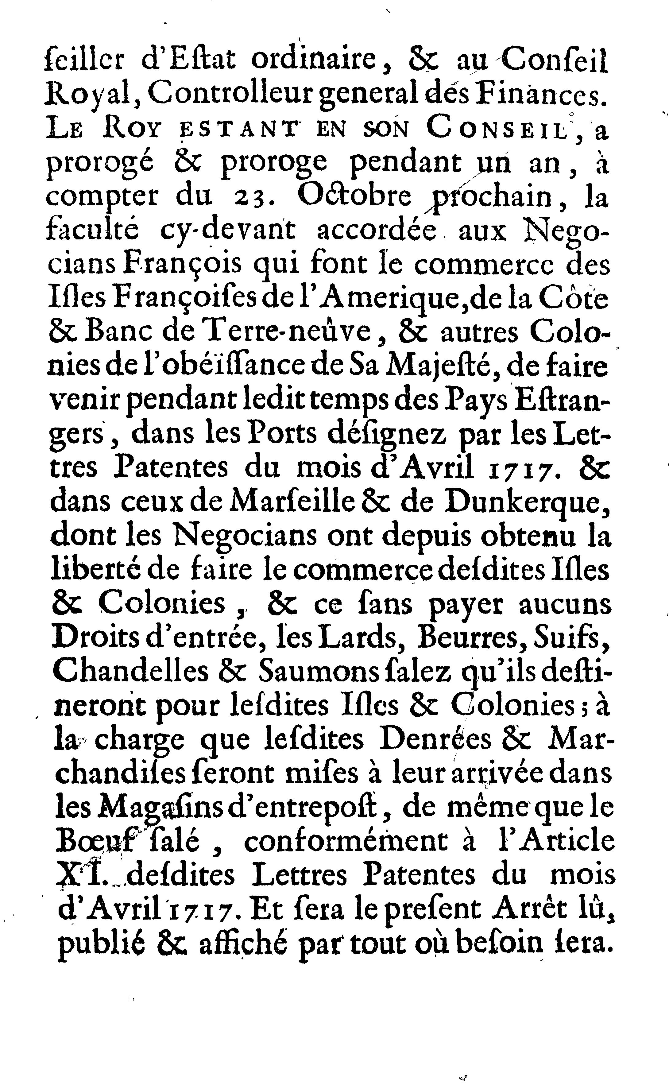 - Arrest du Conseil d'Estat du roy : qui proroge pendant un an, à compter du 23. octobre prochain, la permission cy-devant accordée aux negocians françois qui font le commerce des isles & colonies françoises de l'Amerique, de faire venir des pays estrangers des lards, beurres, suifs, chandelles & saumons salez, sans payer aucuns droits : du 27 juillet 1728 : extrait des registres du Conseil d'Estat.