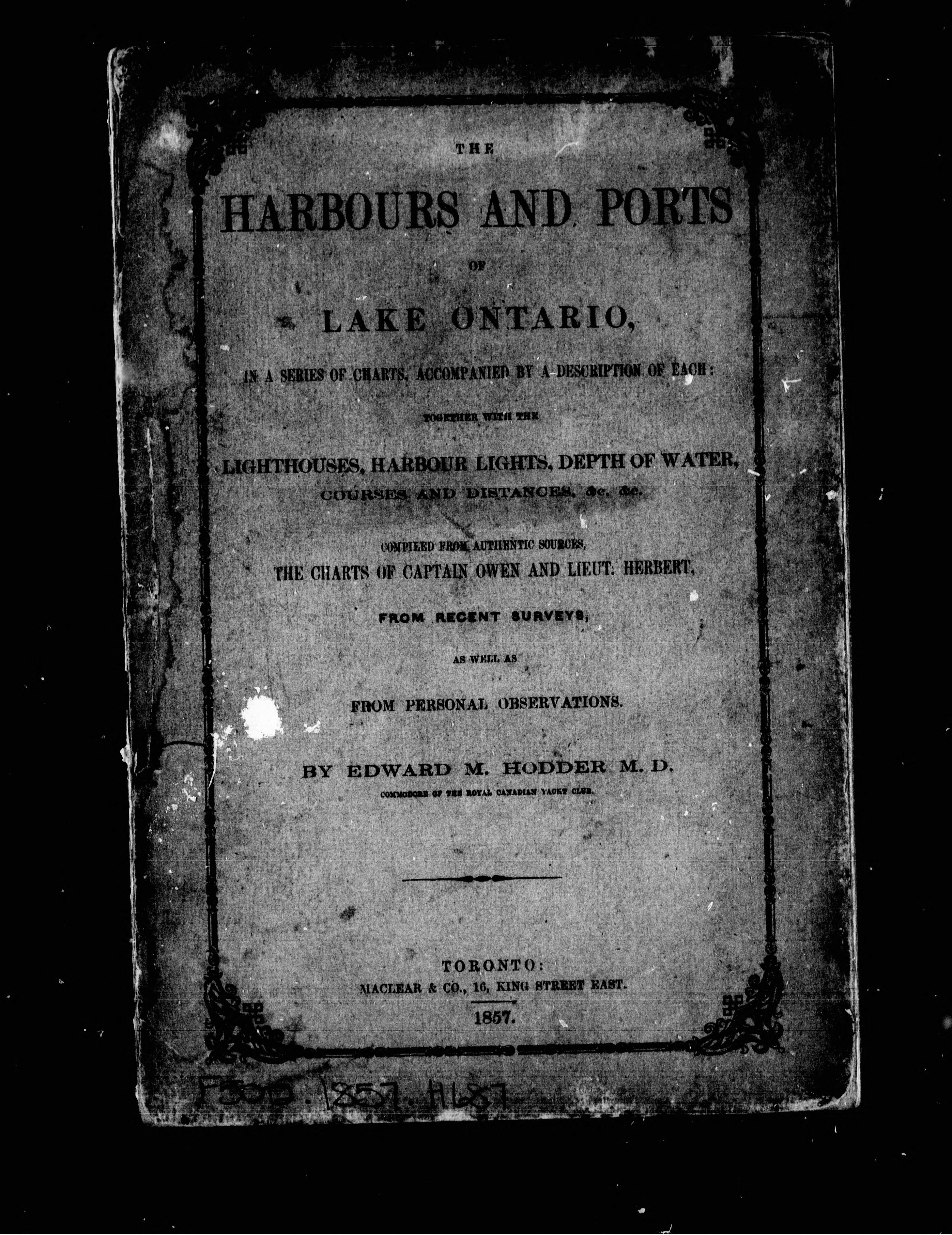 - The Harbours and ports of Lake Ontario : in a series of charts, accompanied by a description of each, together with the lighthouses, harbour lights, depth of water, courses and distances & c. & c. : compiled from authentic sources, the charts of Captain Owen and Lieut. Herbert, from recent surveys, as well as from personal observations