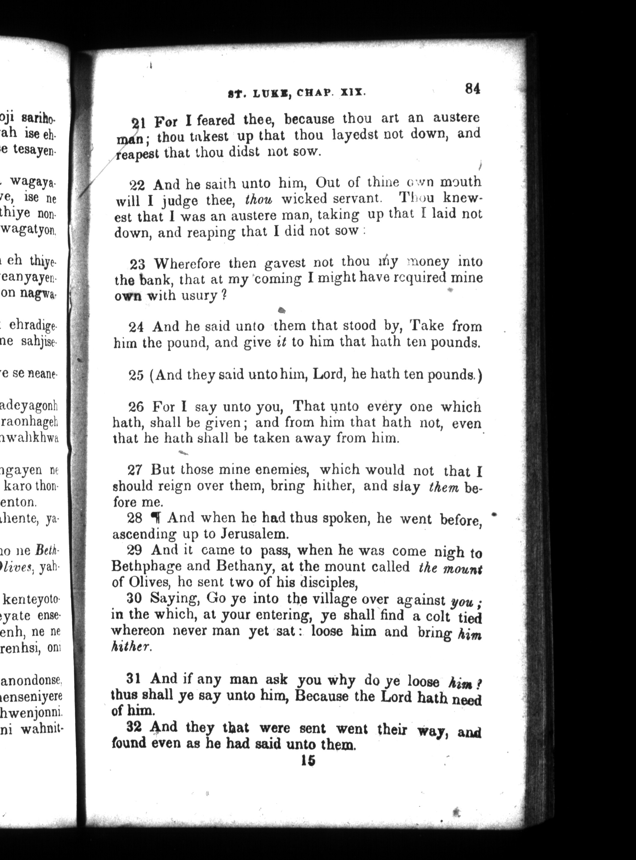 Added title page in English: The Gospel of Our Lord and Saviour Jesus Christ according to Saint Luke / translated into the Mohawk language by A. Hill, and corrected by J.A. Wilkes, Jr.