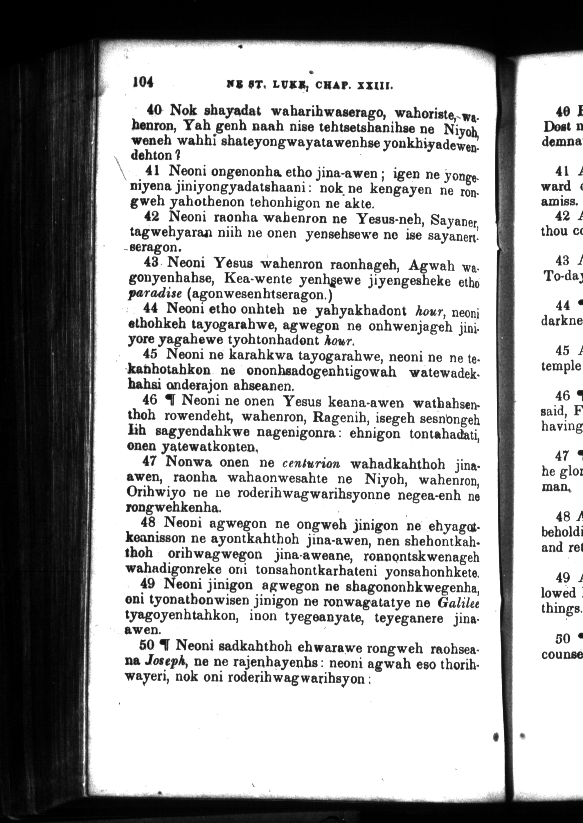 Added title page in English: The Gospel of Our Lord and Saviour Jesus Christ according to Saint Luke / translated into the Mohawk language by A. Hill, and corrected by J.A. Wilkes, Jr.