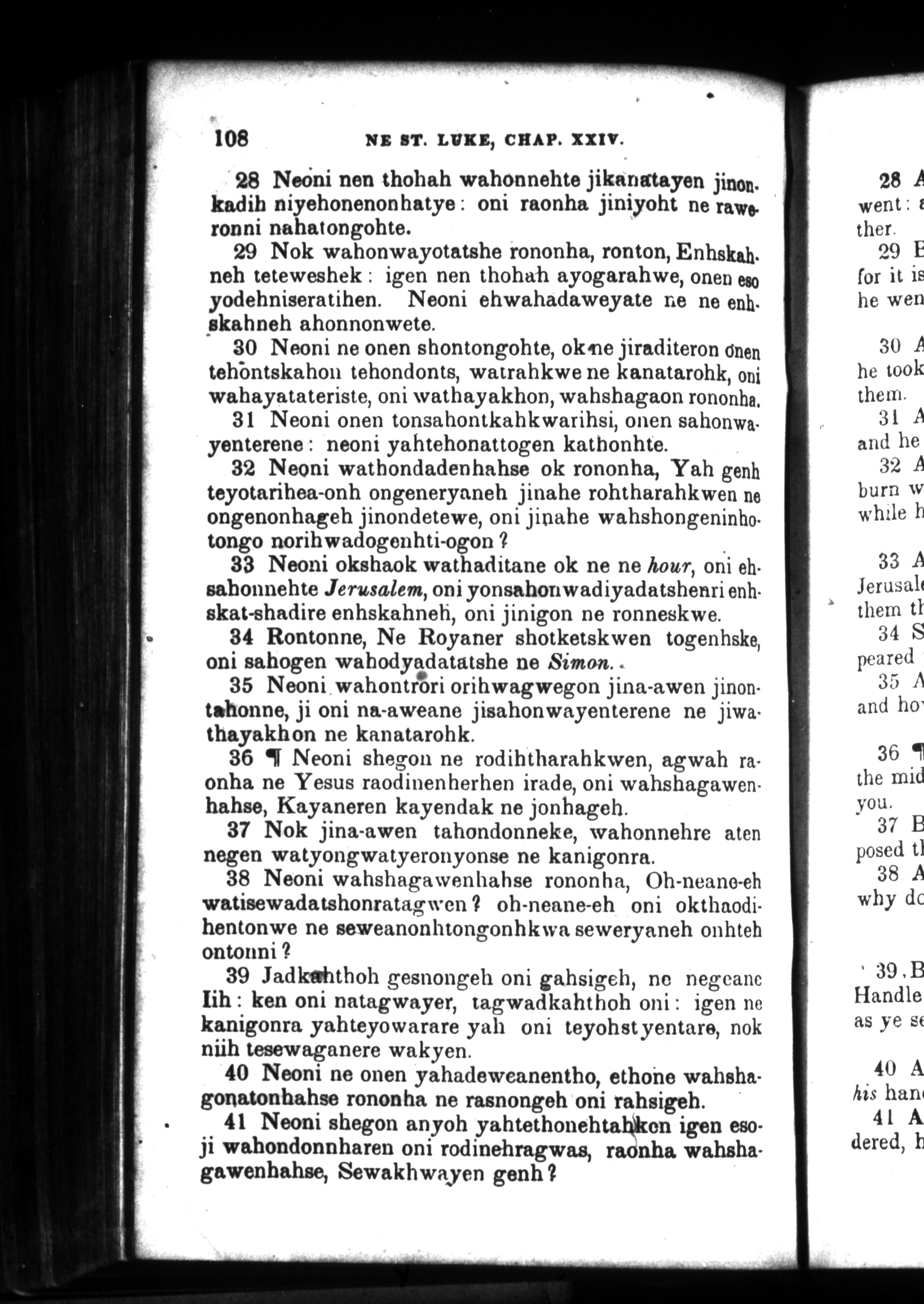 Added title page in English: The Gospel of Our Lord and Saviour Jesus Christ according to Saint Luke / translated into the Mohawk language by A. Hill, and corrected by J.A. Wilkes, Jr.