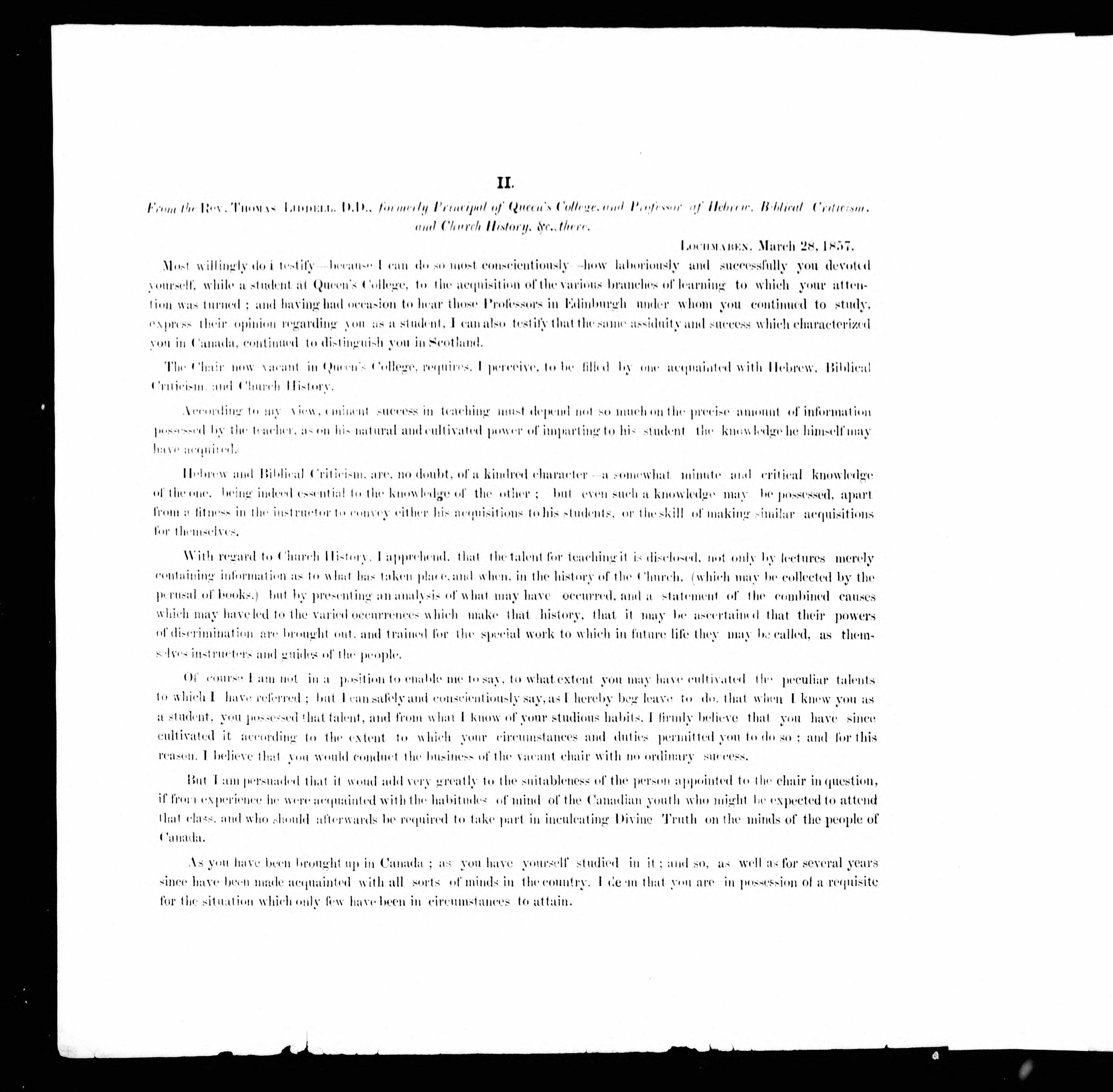 [Letter] : I have applied to the Board of Trustees of Queen's College, to be appointed to the vacant chair of Hebrew, biblical criticism, and church history, and I take the liberty of sending you a copy of my letter of application, and also of the testimonials ..
