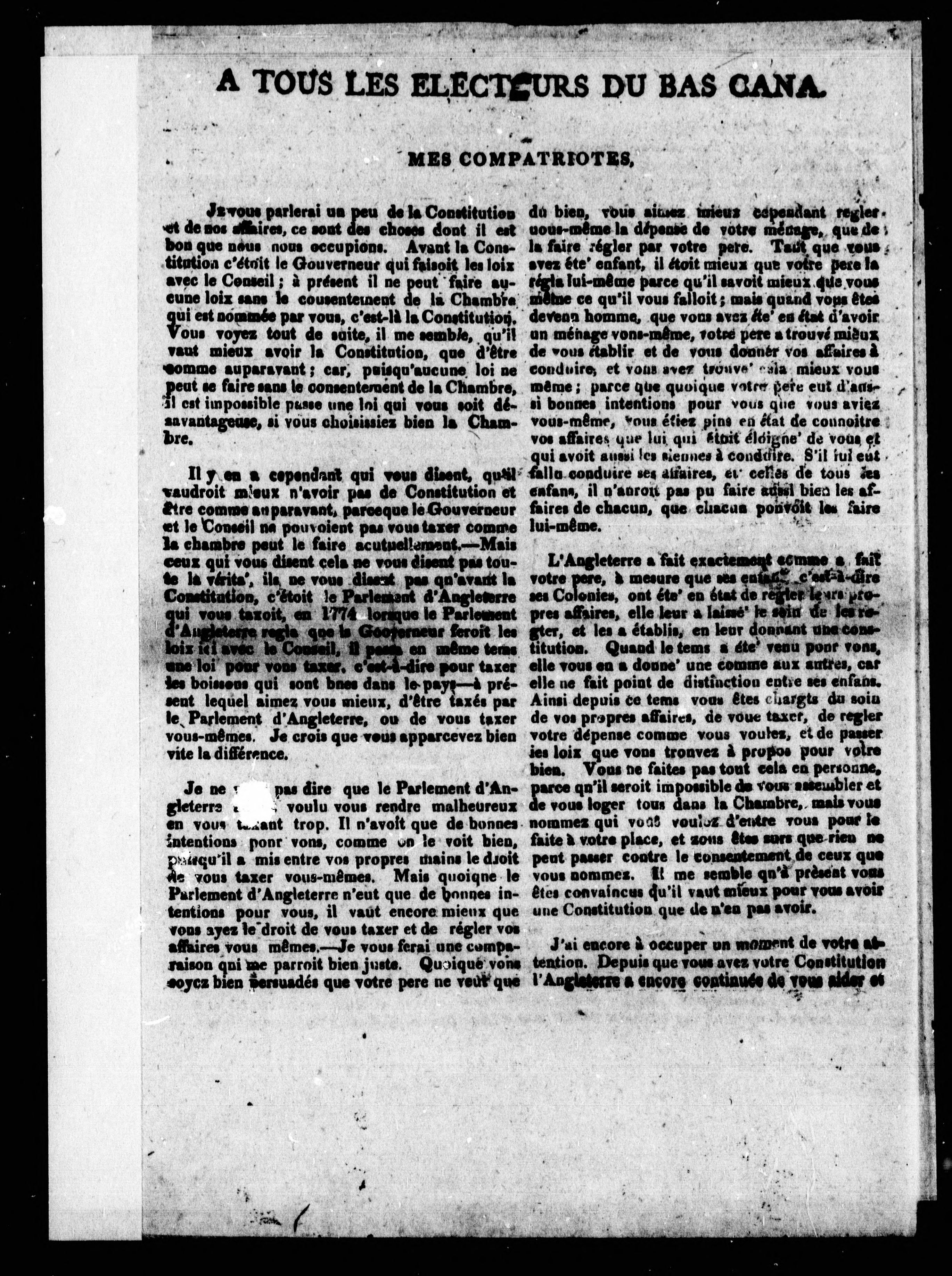 - A tous les electeurs du Bas Cana. [i.e. Canada] : je vous parlerai un peu de la constitution et de nos affaires ..