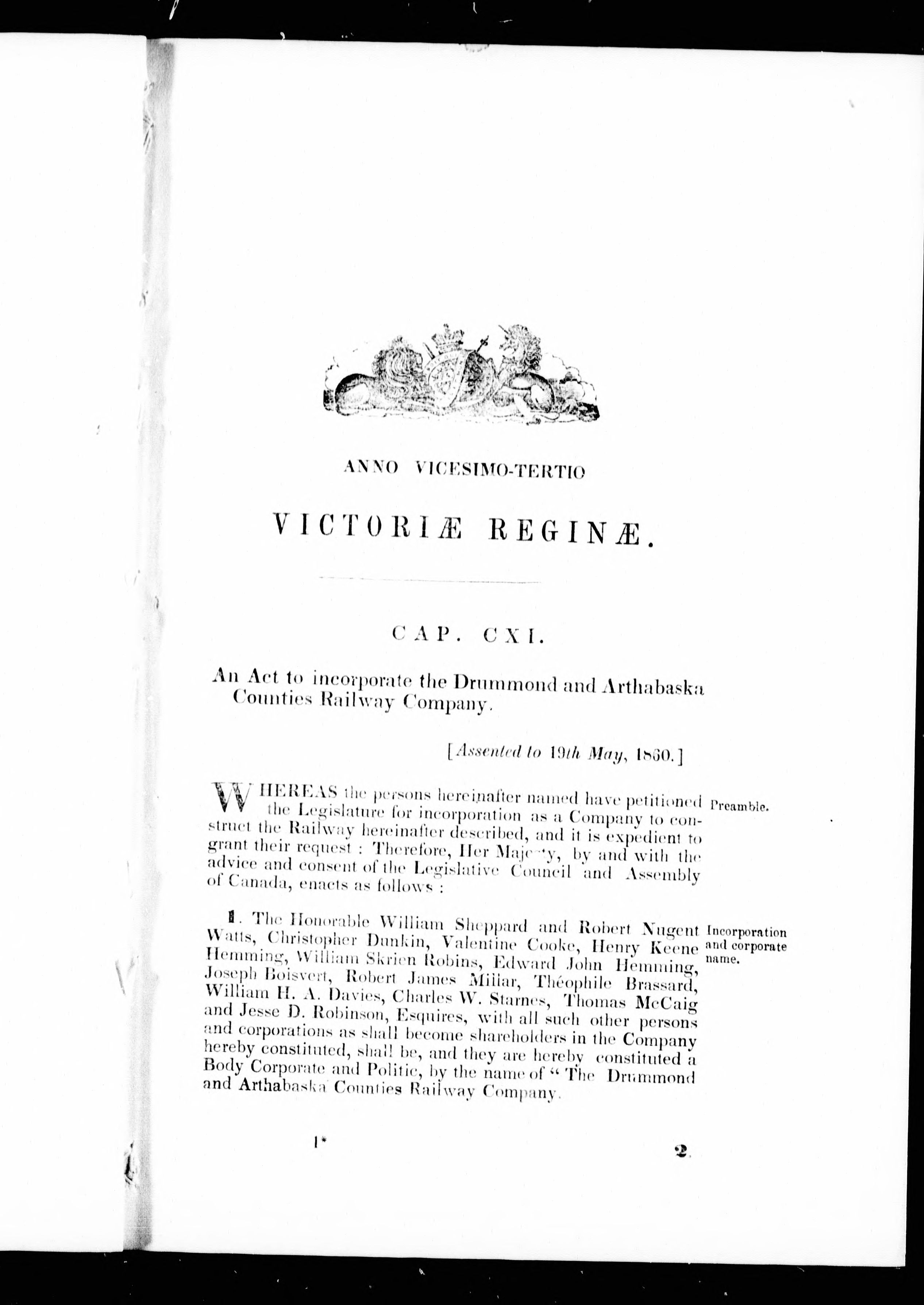- An Act to incorporate the Drummond and Arthabaska Counties Railway Company : 23 Vict. Cap. 111.