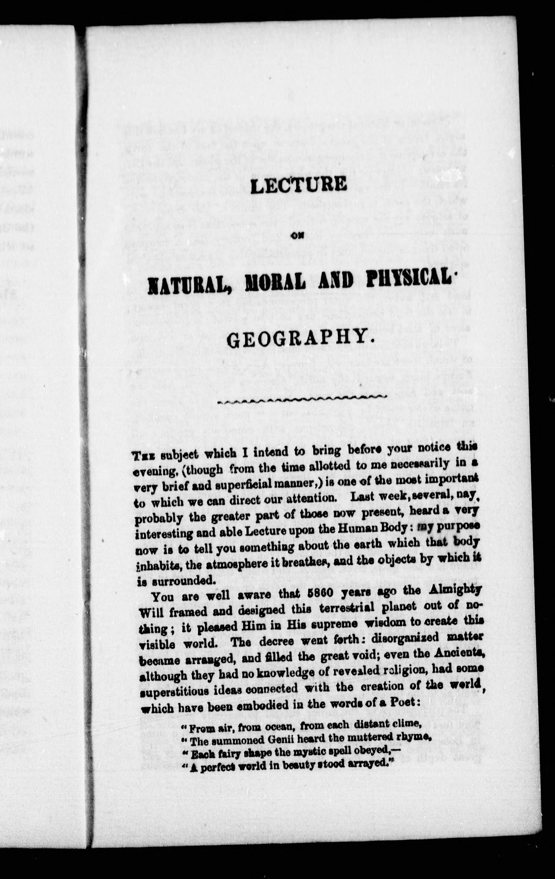 - A lecture on natural, moral and physical geography : delivered before the Hemmingford Mechanics Institute and Library Association, (Canada East), Wednesday, 23rd January, 1856