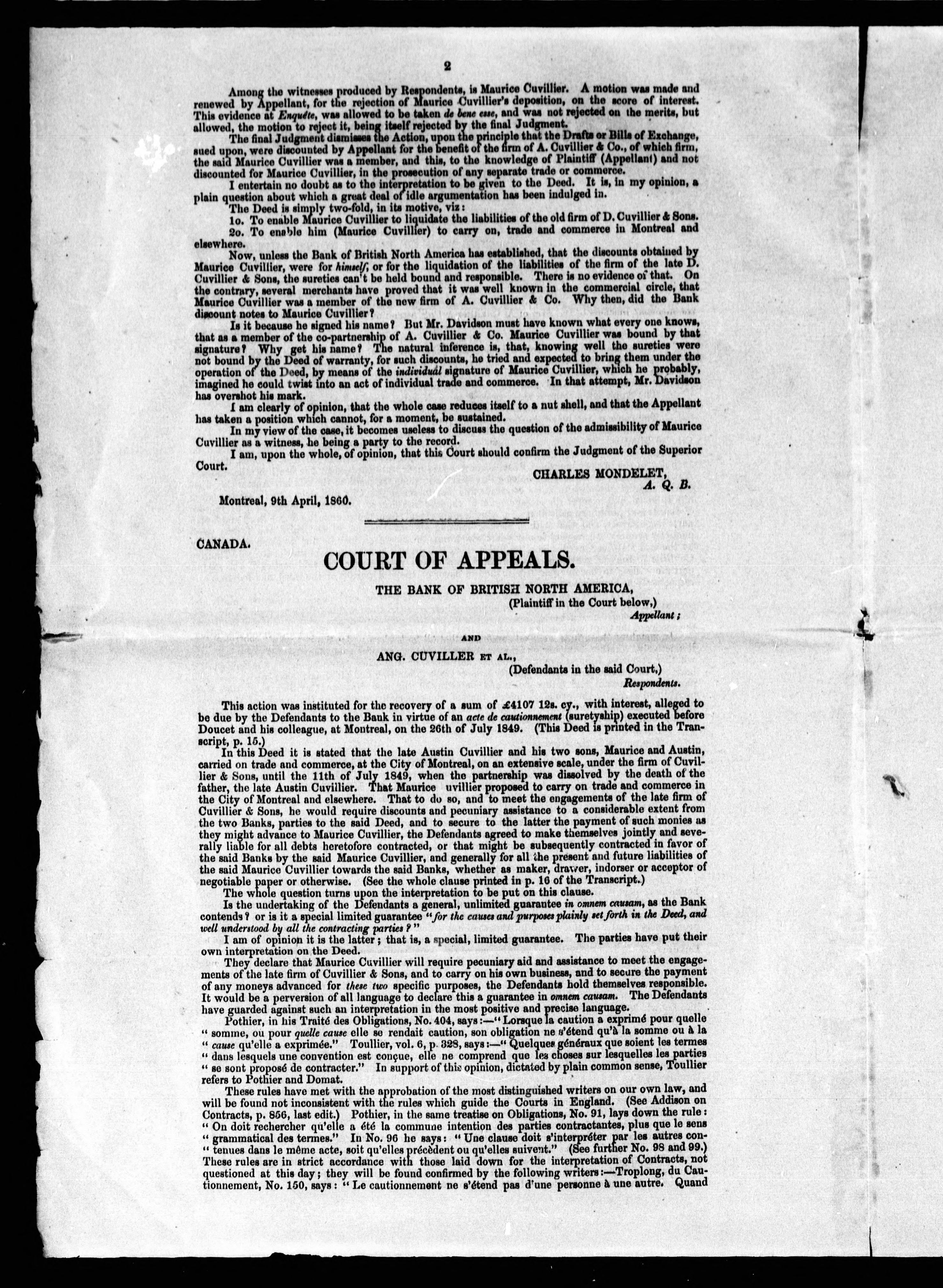 - Judge Aylwin's opinion in a case between the Bank of British North America, appellant, and Angelique Cuvillier, et al., respondents.