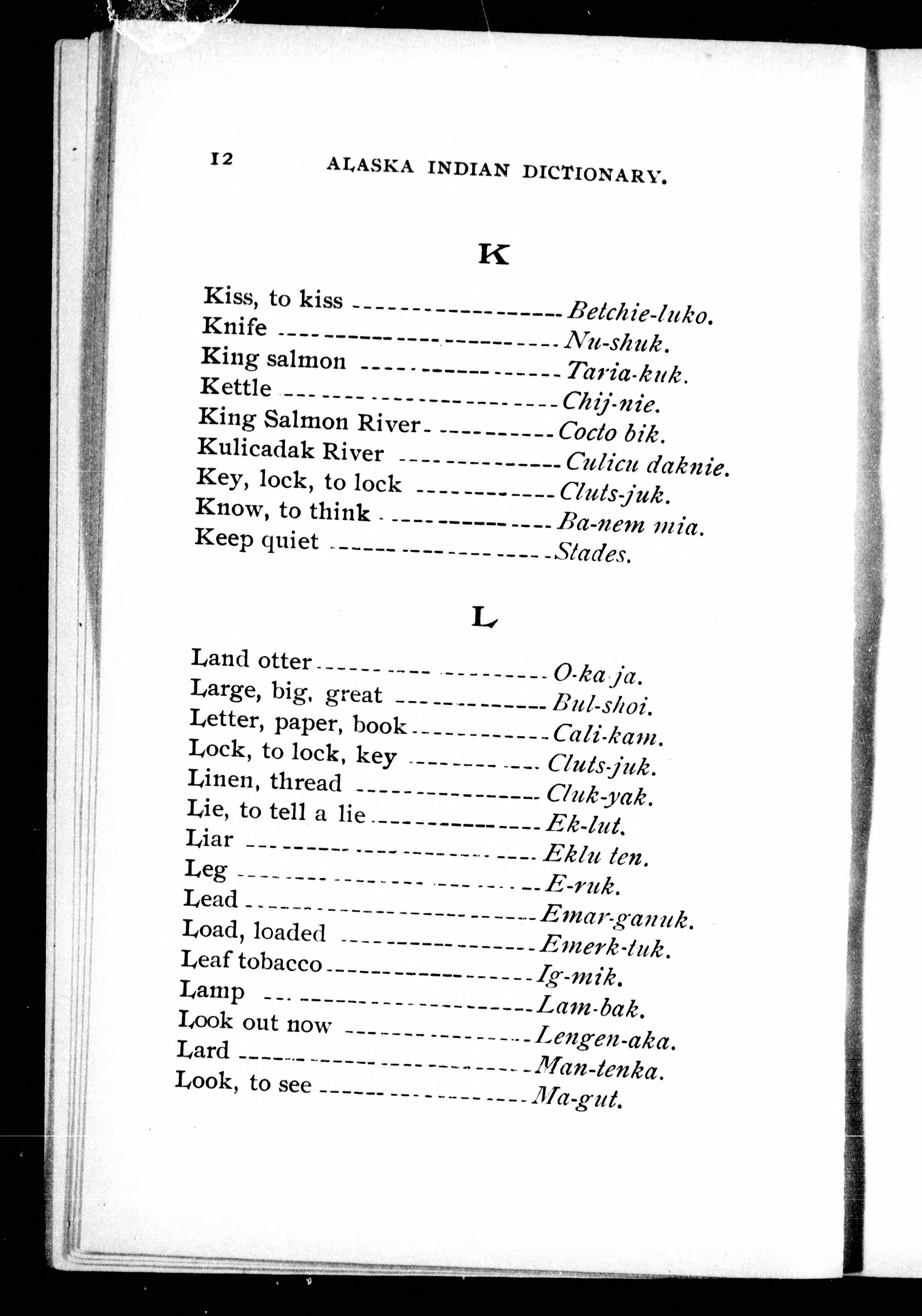 Aleutian Indian and English dictionary : common words in the dialects of the Aleutian Indian language as spoken by the Oogashik, Egashik, Egegik, Anangashuk and Misremie tribes around Sulima River and neighboring parts of the Alaska peninsula