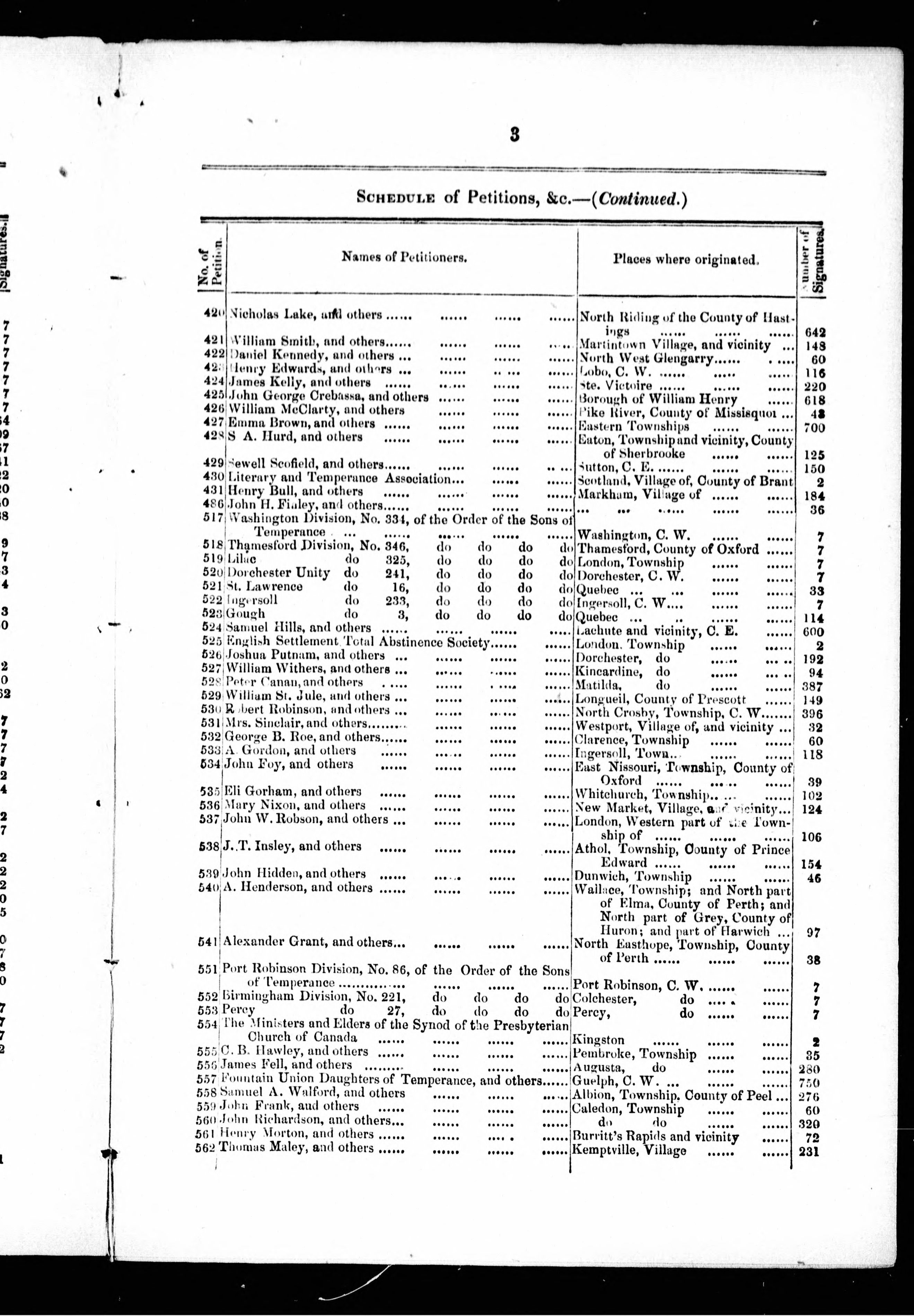 - Schedule of petitions received during the first part of the present session, ending on the eighteenth day of December, 1854 : praying for the passing of a prohibitory liquor law.