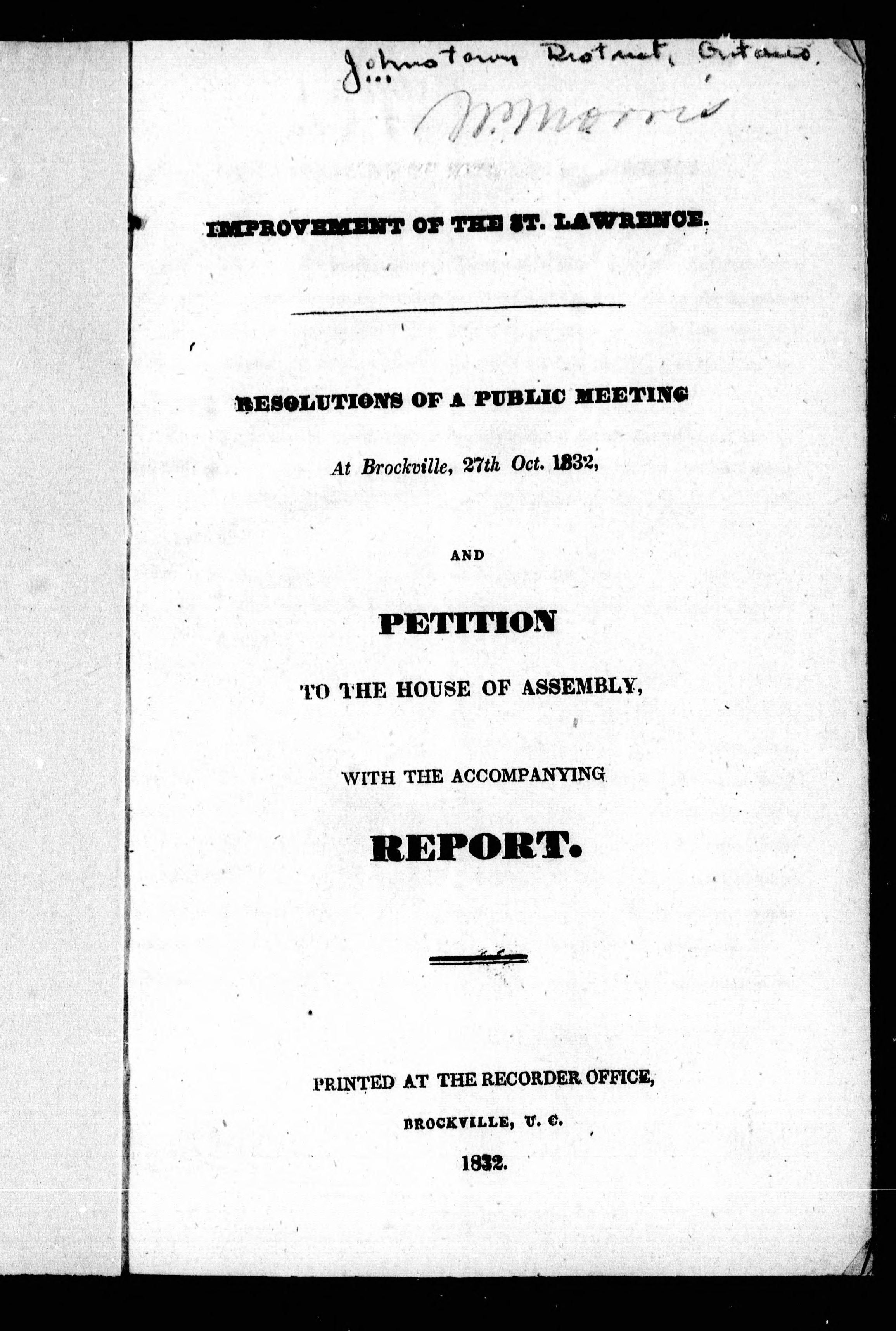 Improvement of the St. Lawrence : resolutions of a public meeting at Brockville, 27th Oct. 1832 and petition to the House of Assembly, with the accompanying report.