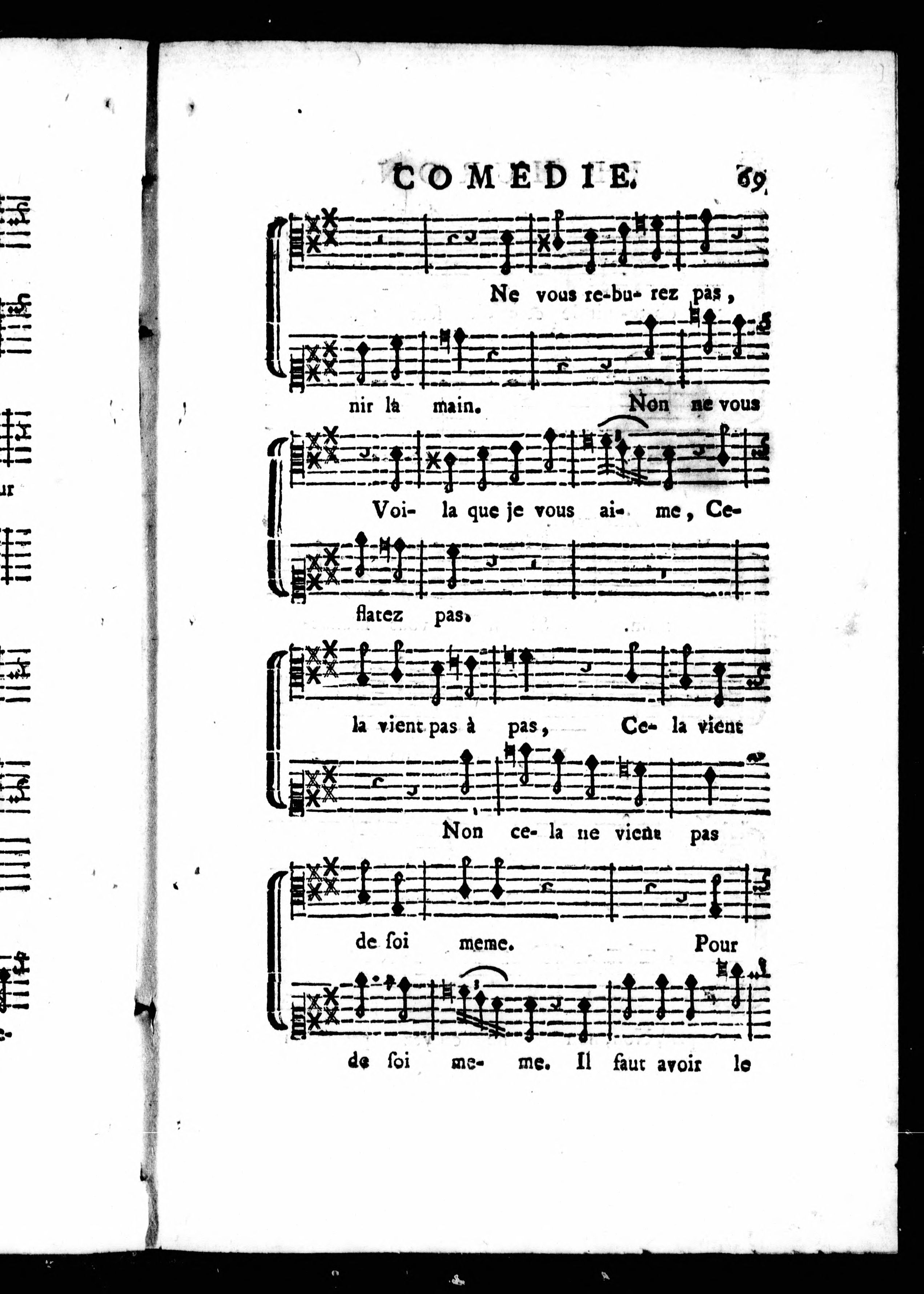- Le Huron : comédie en deux actes et en vers, mêlée d'arriettes, représentée pour la première fois par les comédiens italiens ordinaires du roi, le 20 août 1768.