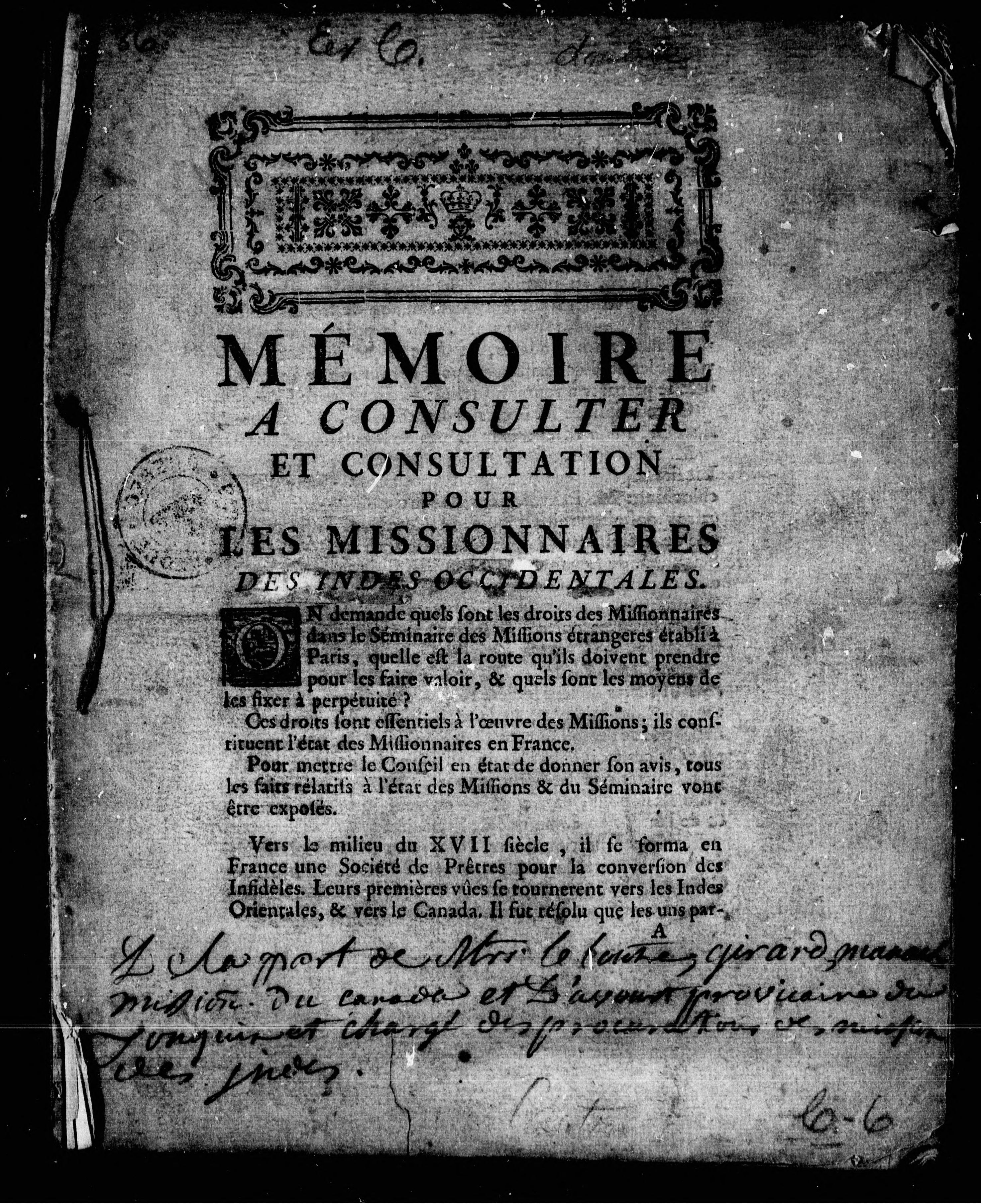 Mémoire a consulter et consultation pour les misionnaires des Indes occidentales.