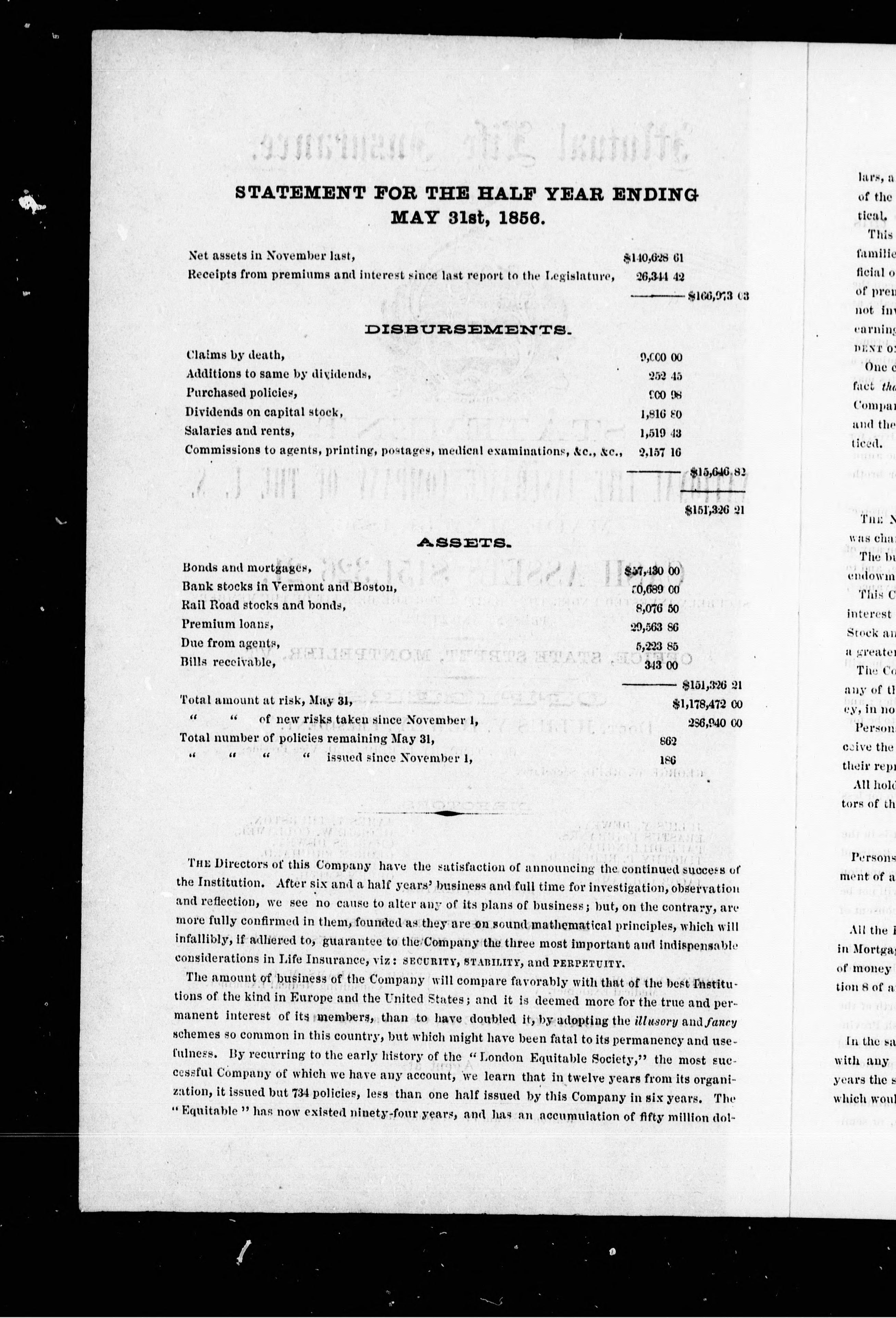 Statement of the National Life Insurance Company of the U.S. made May 31, 1856 :