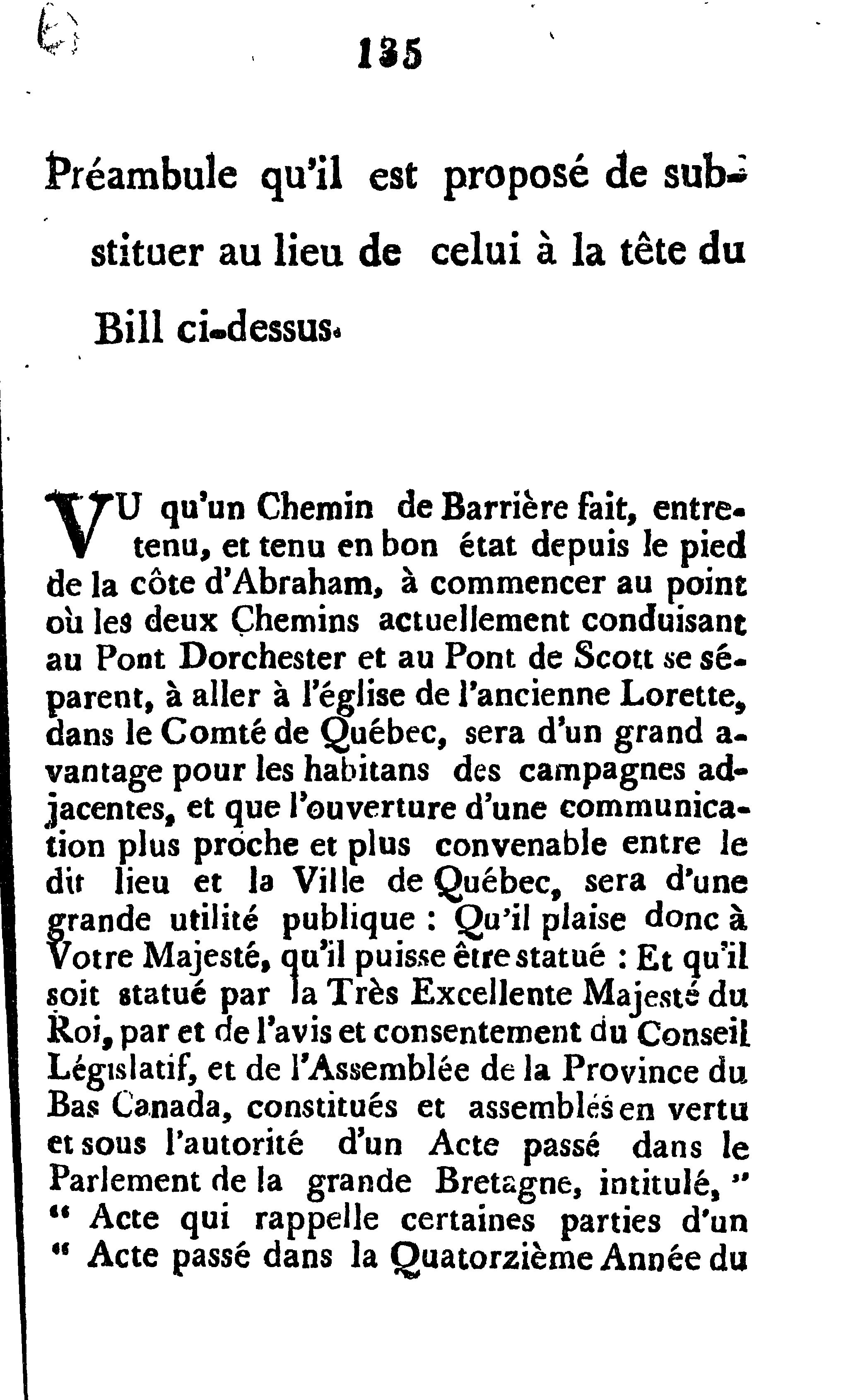 Bill introduit dans la Chambre d'assemblée du Bas-Canada pour incorporer certaines personnes y mentionnées aux fins de faire et entretenir des chemins de barrière dans et près la banlieue de Québec