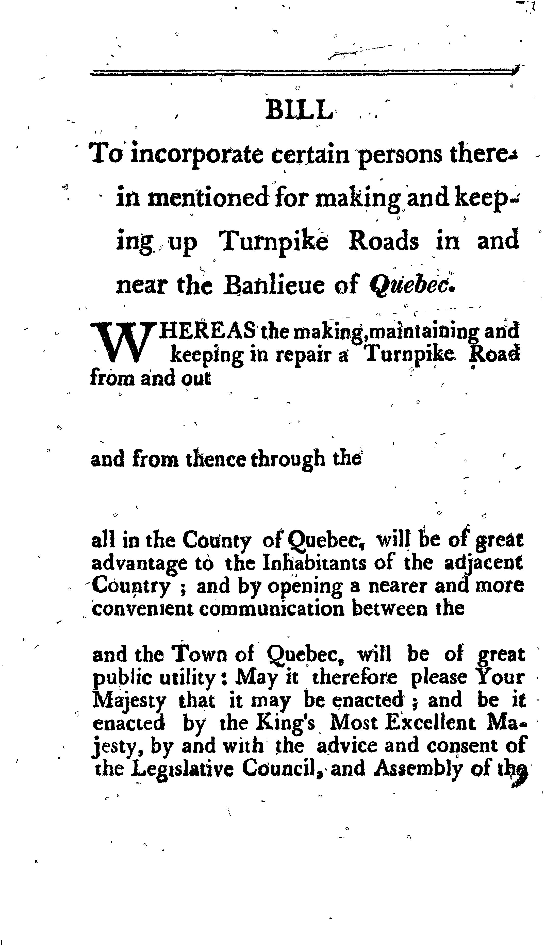 - Lower Canada. Bill to Incorporate Certain Persons Therein Mentioned for Making and Keeping up Turnpike Roads in and near the Banlieue of Quebec.