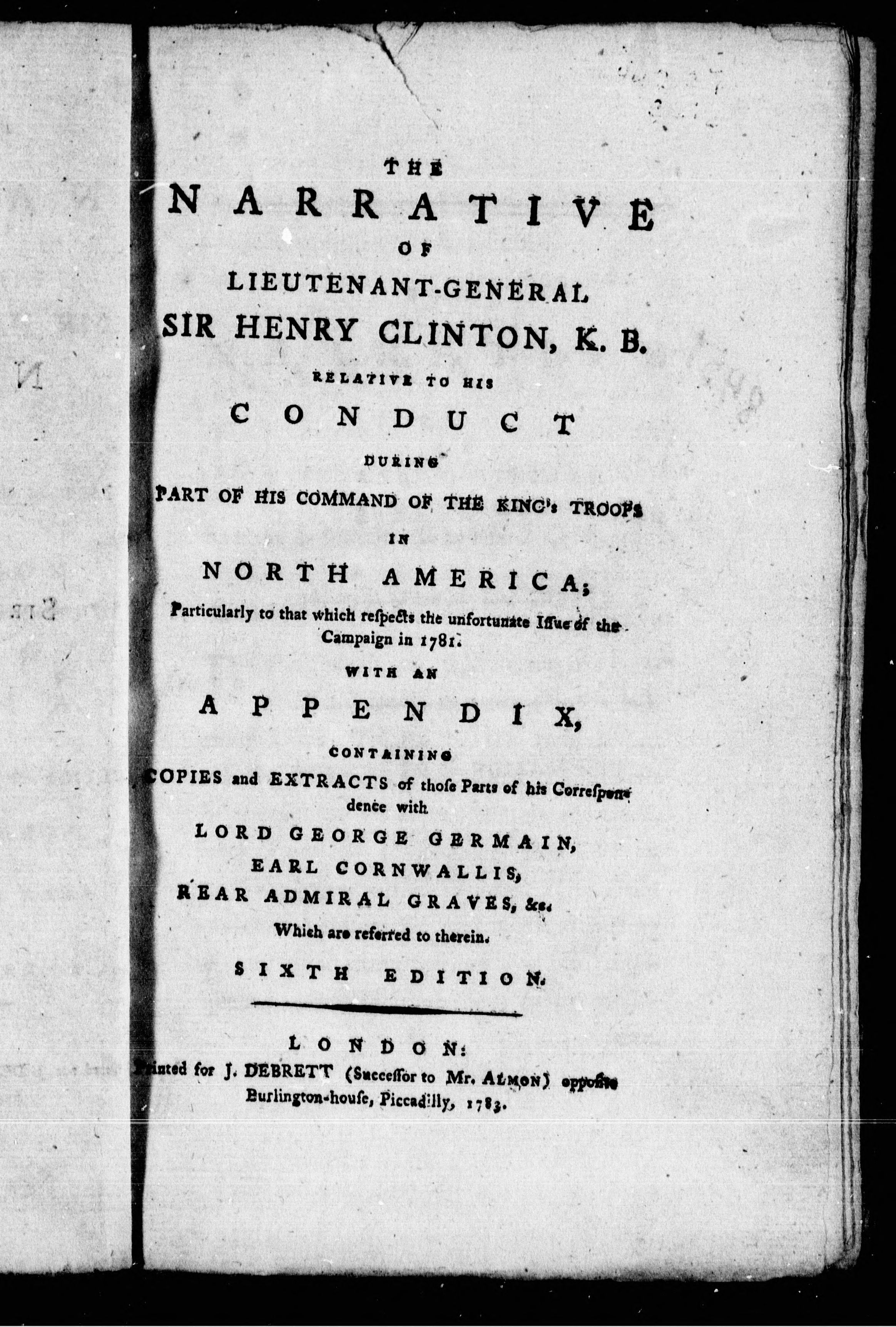 - The narrative of Lieutenant-General Sir Henry Clinton, K.B. relative to his conduct during part of his command of the king's troops in North America : particularly to that which respects the unfortunate issue of the campaign in 1781 : with an appendix, containing copies and extracts of those parts of his correspondence with Lord George Germain, Earl Cornwallis, Rear Admiral Graves, &c. which are referred to therein.