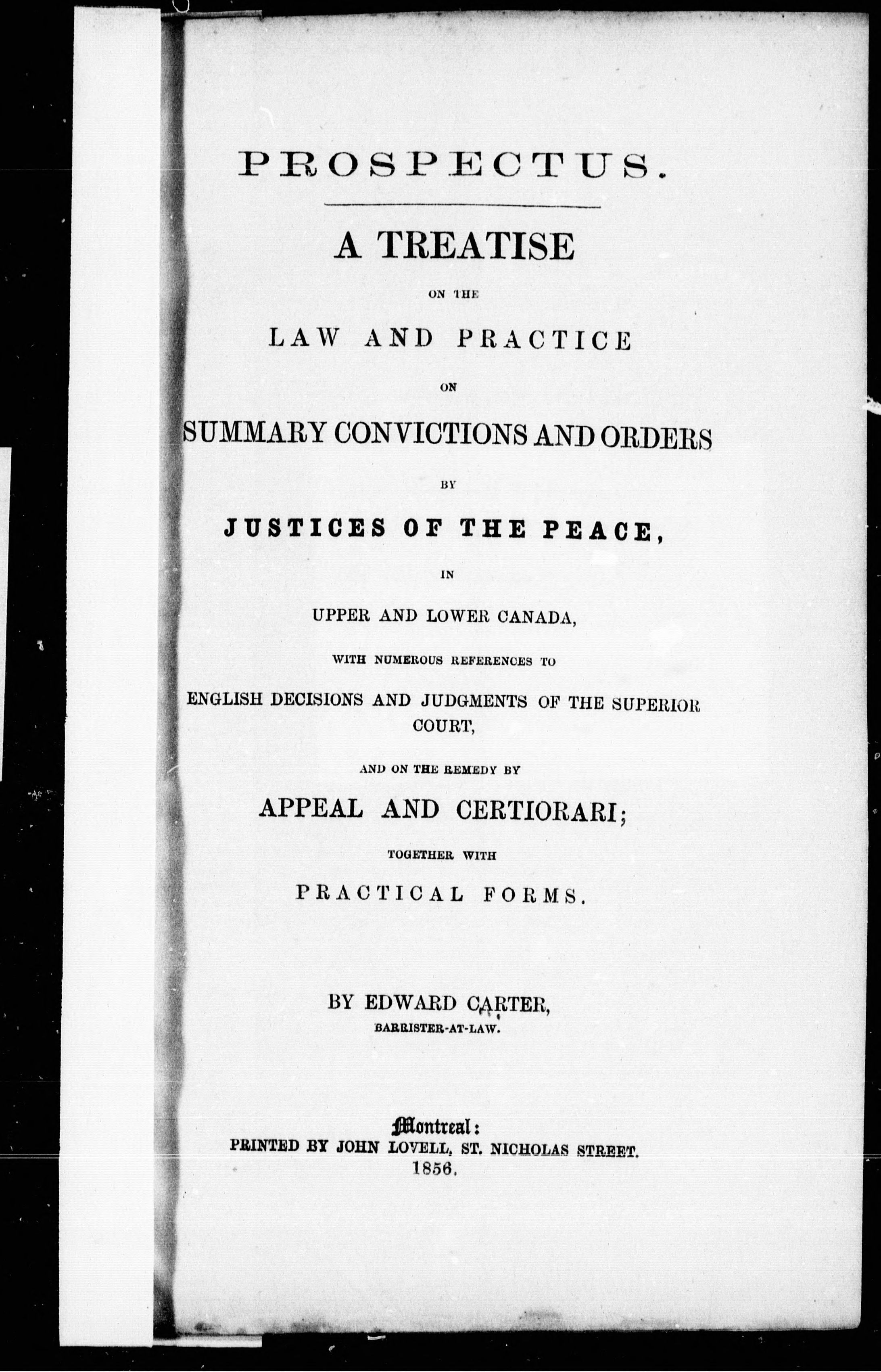Prospectus : a treatise on the law and practice on summary convictions and orders by justices of the peace, in Upper and Lower Canada, with numerous references to English decisions and judgements of the Superior Court, and on the remedy by appeal and certiorari; together with practical forms