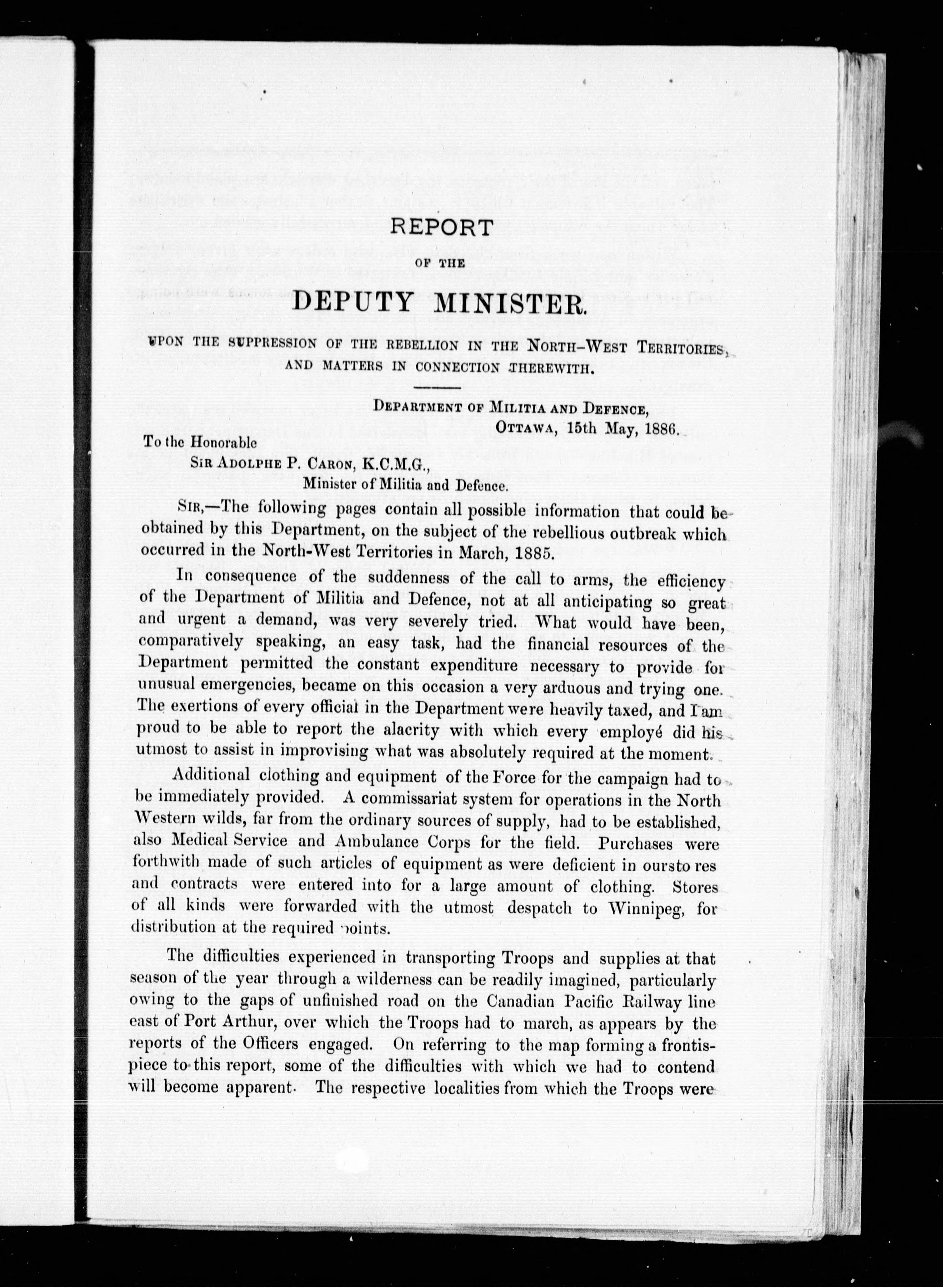 - Report upon the suppression of the rebellion in the North-West Territories : and matters in connection therewith, in 1885.