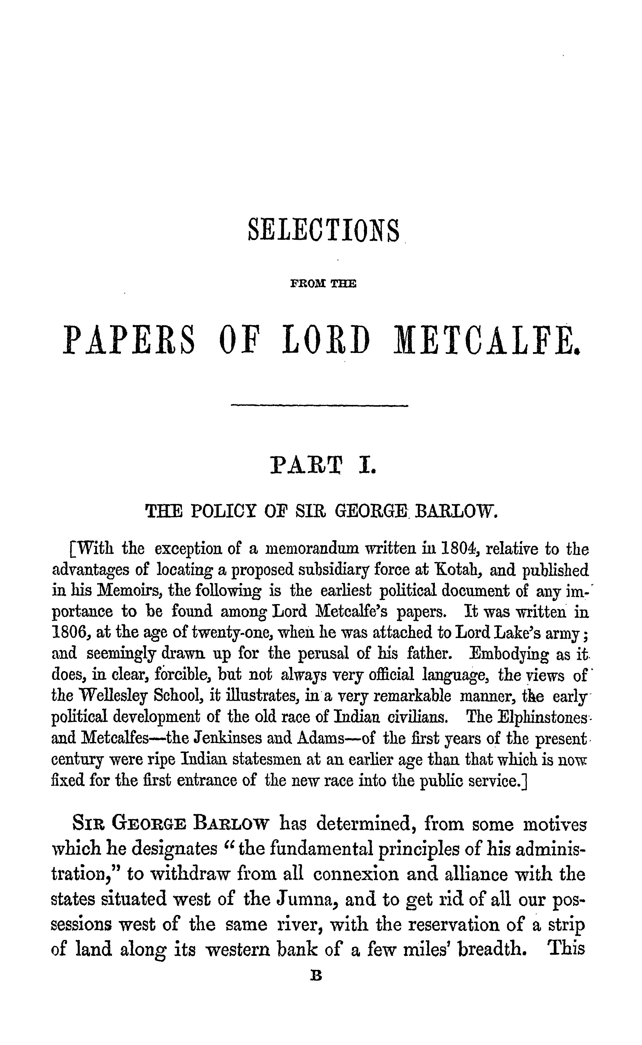 Selections from the papers of Lord Metcalfe, late Governor-General of India, Governor of Jamaica, and Governor-General of Canada
