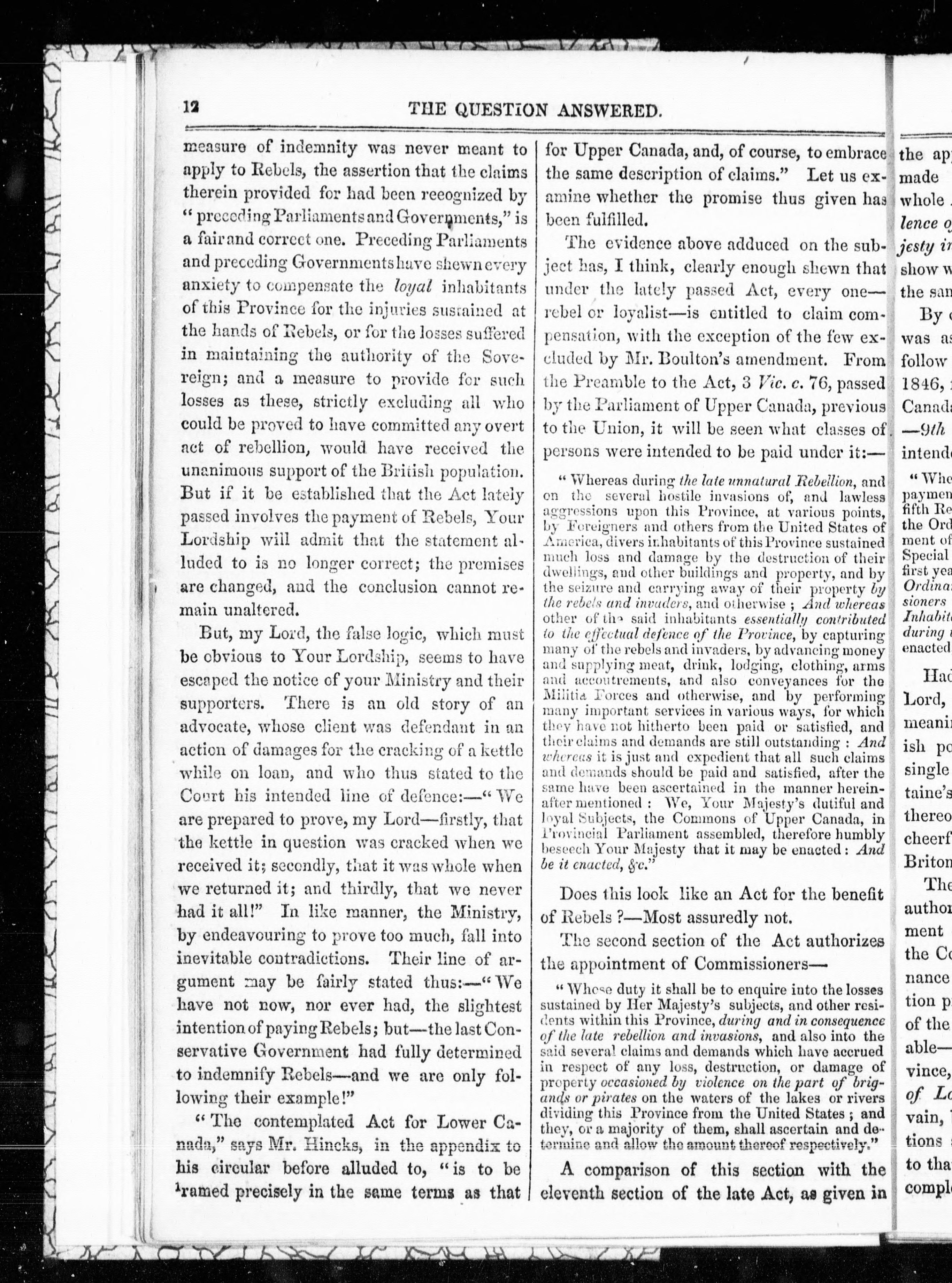 Canada.Lois d'indemnisation des victimes de 1837-1838.