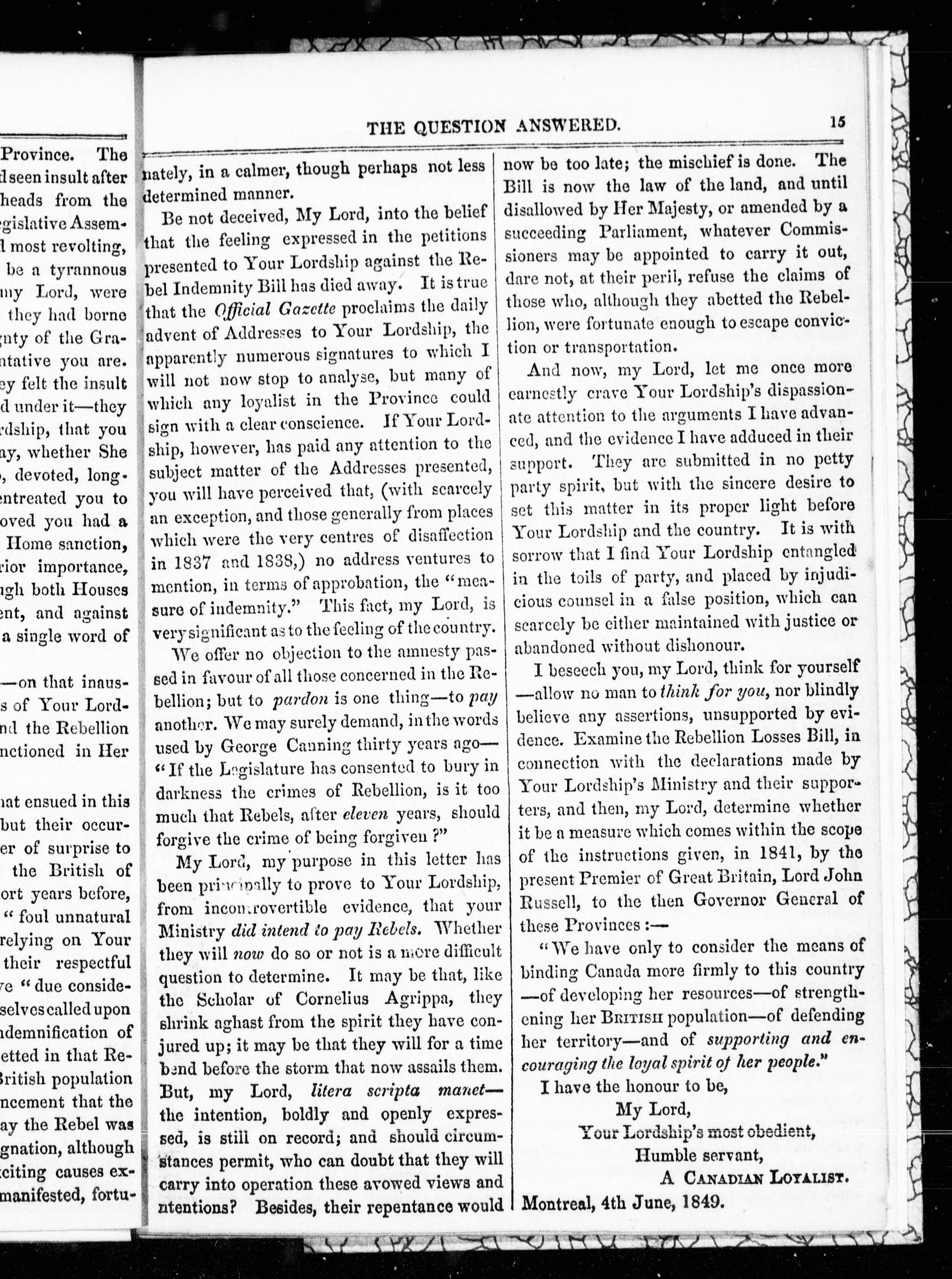 Signed and dated: A Canadian loyalist, Montreal, 4th June, 1849.