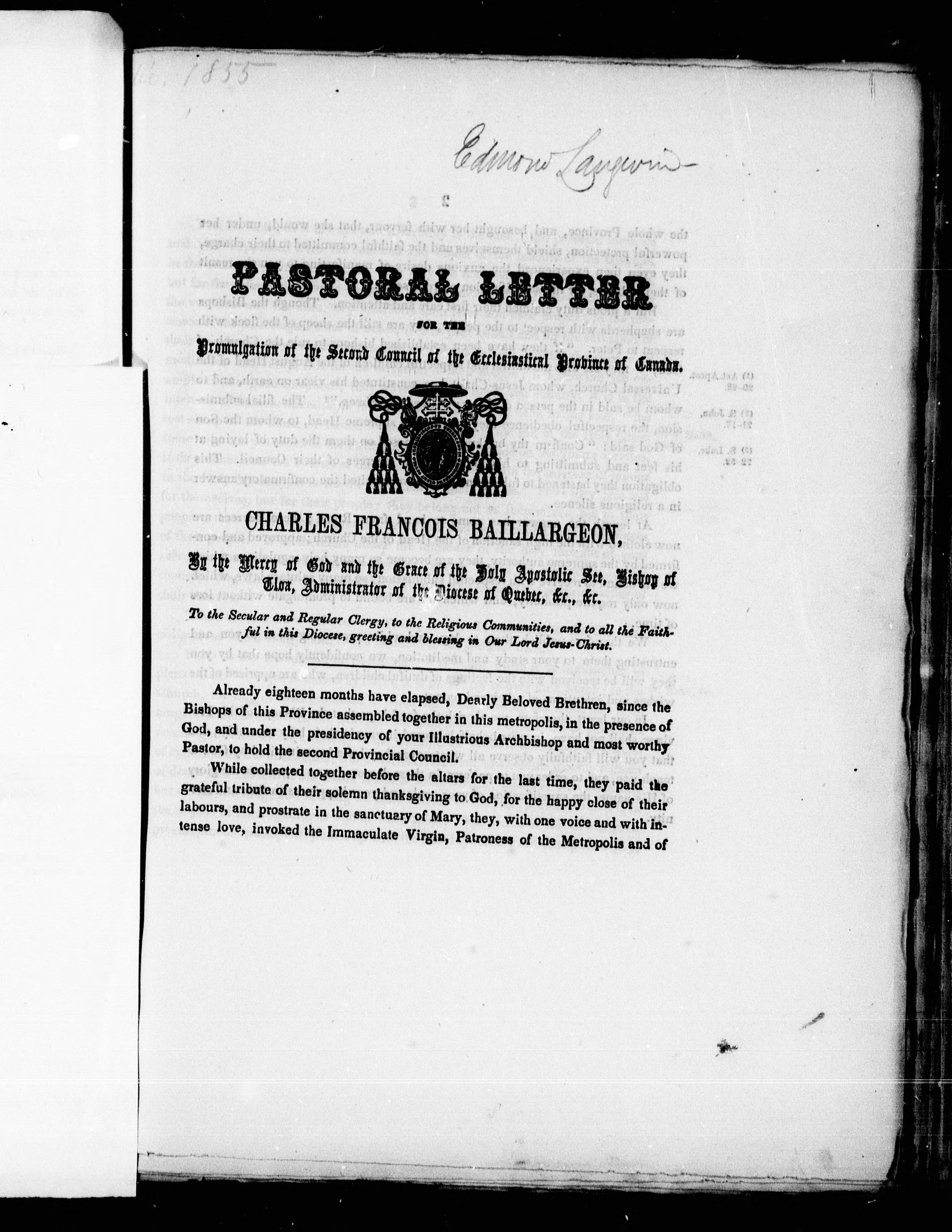 Pastoral letter for the promulgation of the second council of the ecclesiastical province of Canada : Charles François Baillargeon, by the mercy of God and the grace of the Holy Apostolic See, Bishop of Tloa, Administrator of the diocese of Quebec, &c. &c. to the secular and regular clergy, to the religious communities, and to all the faithful in this diocese, greeting and blessing in Our Lord Jesus-Christ. - Published