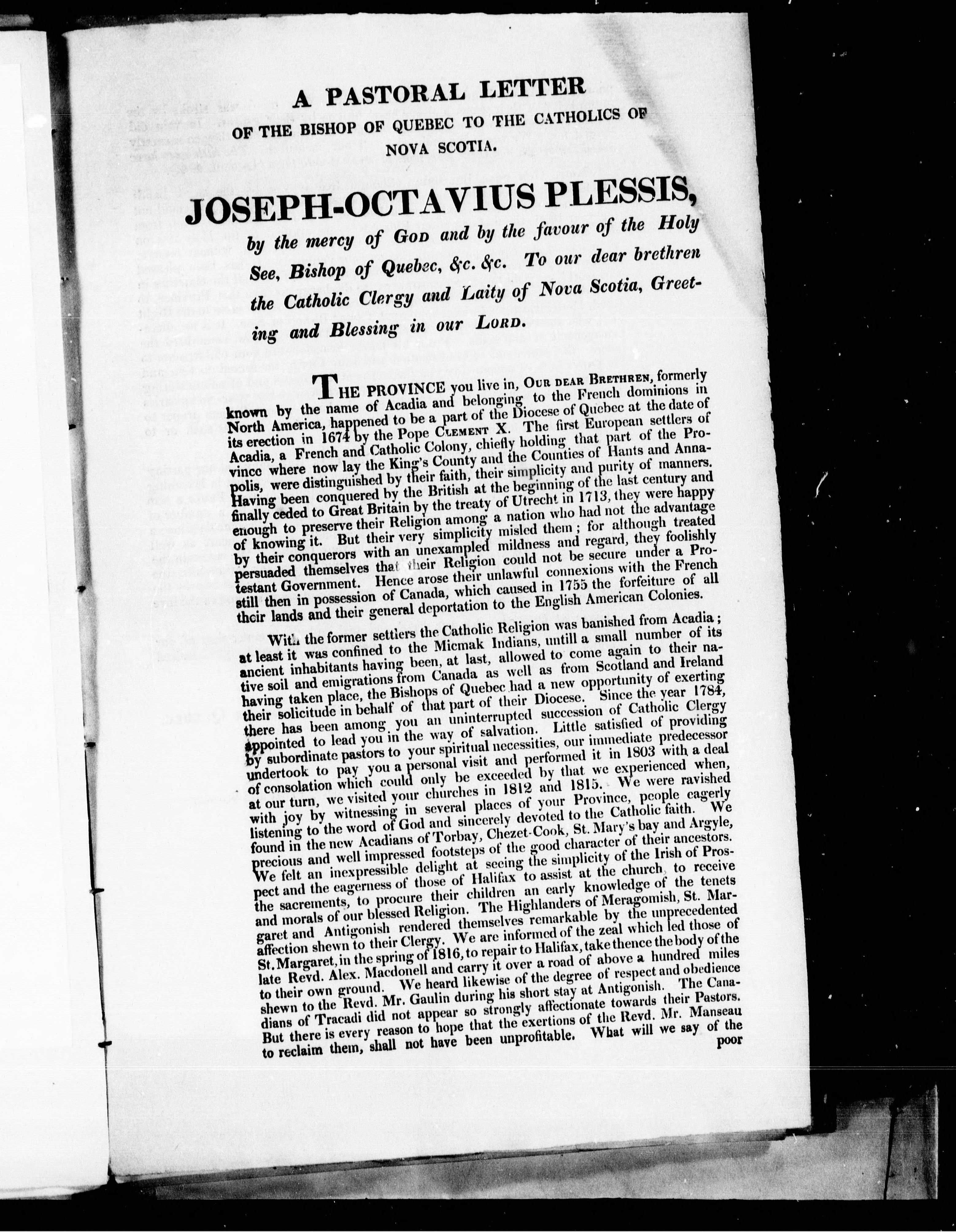 A pastoral letter of the Bishop of Quebec to the Catholics of Nova Scotia : Joseph-Octavius Plessis, by the mercy of God and by the favour of the Holy See, Bishop of Quebec, &c., &c. .. - Published