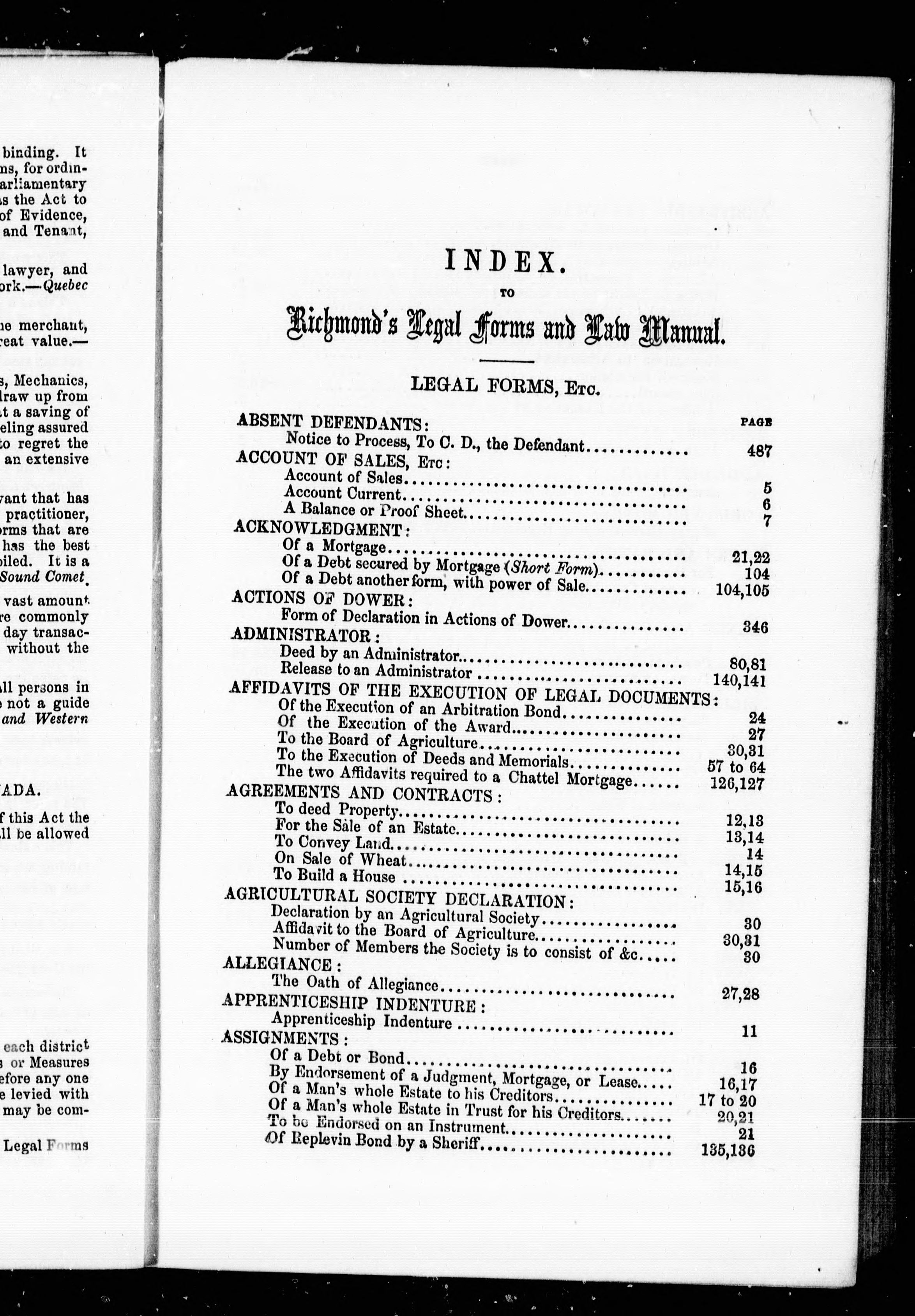 Richmond's book of legal forms and law manual for the legal transaction of business : adapted to the use of county and town officers, merchants, clerks, mechanics, farmers, professional men, justices of the peace, coroners, sheriffs, bailiffs, and to the use of all persons in every station of life ... with upwards of forty of the latest Parliamentary acts ...