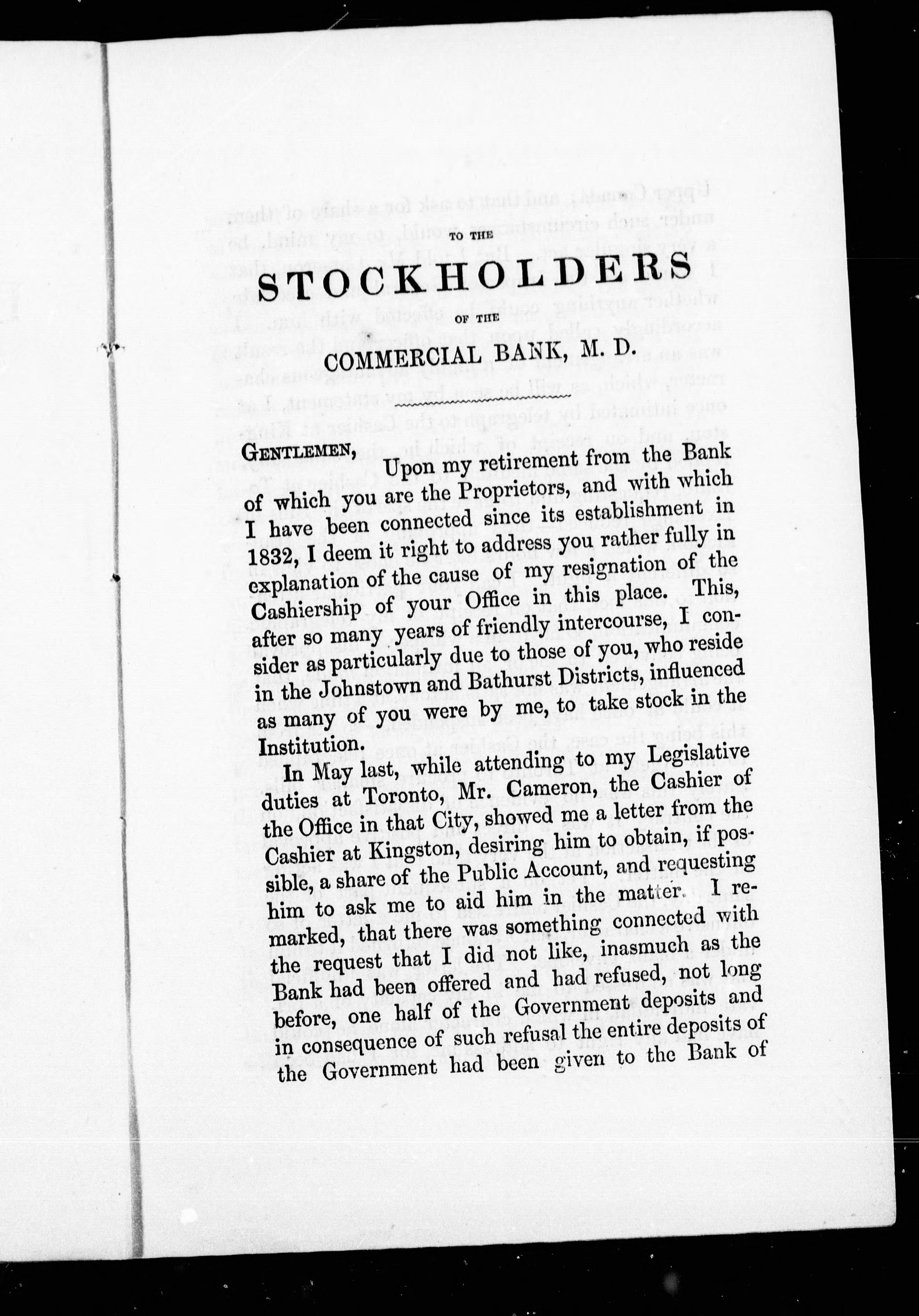- Letter of the Hon. James Morris of Brockville, to the stockholders of the Commercial Bank of the Midland District.