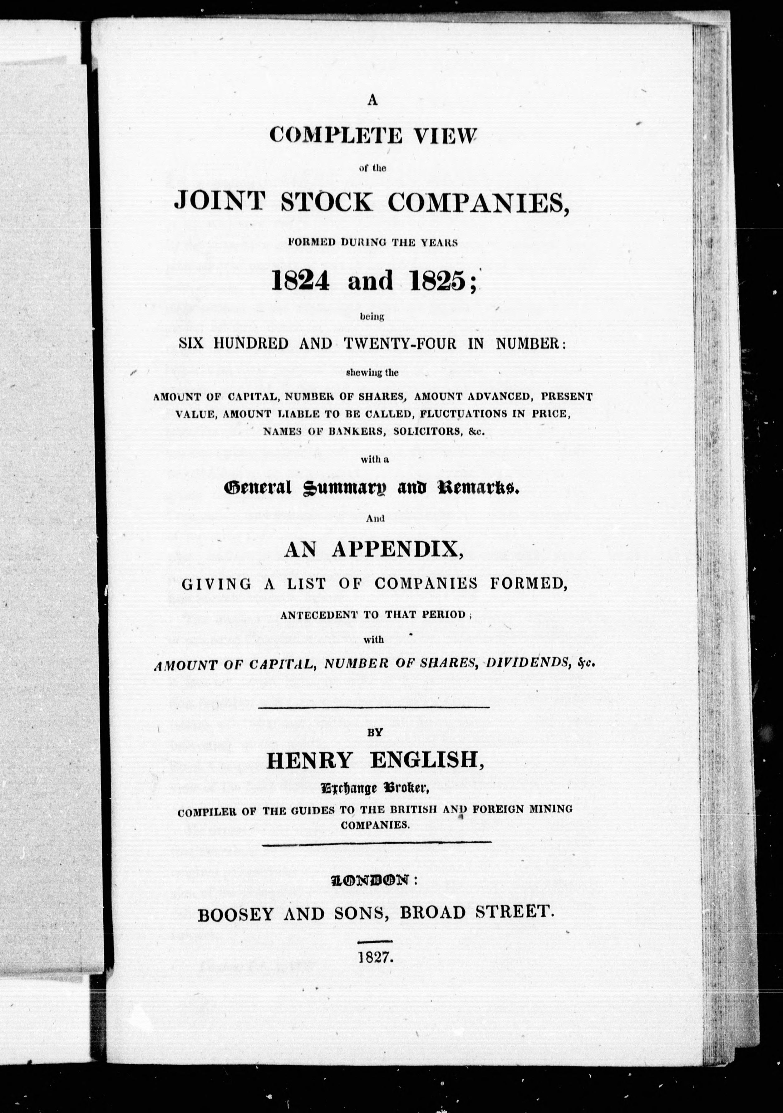 - A complete view of the joint stock companies formed during the years 1824 and 1825 : being six hundred and twenty-four in number, shewing the anount of capital, number of shares, amount advanced, present value, amount liable to be called, fluctuations in price, names of bankers, solicitors, &c., with a general summary and remarks, and an appendix giving a list of companies formed antecedent to that period, with amount of capital, number of shares, dividends, & c