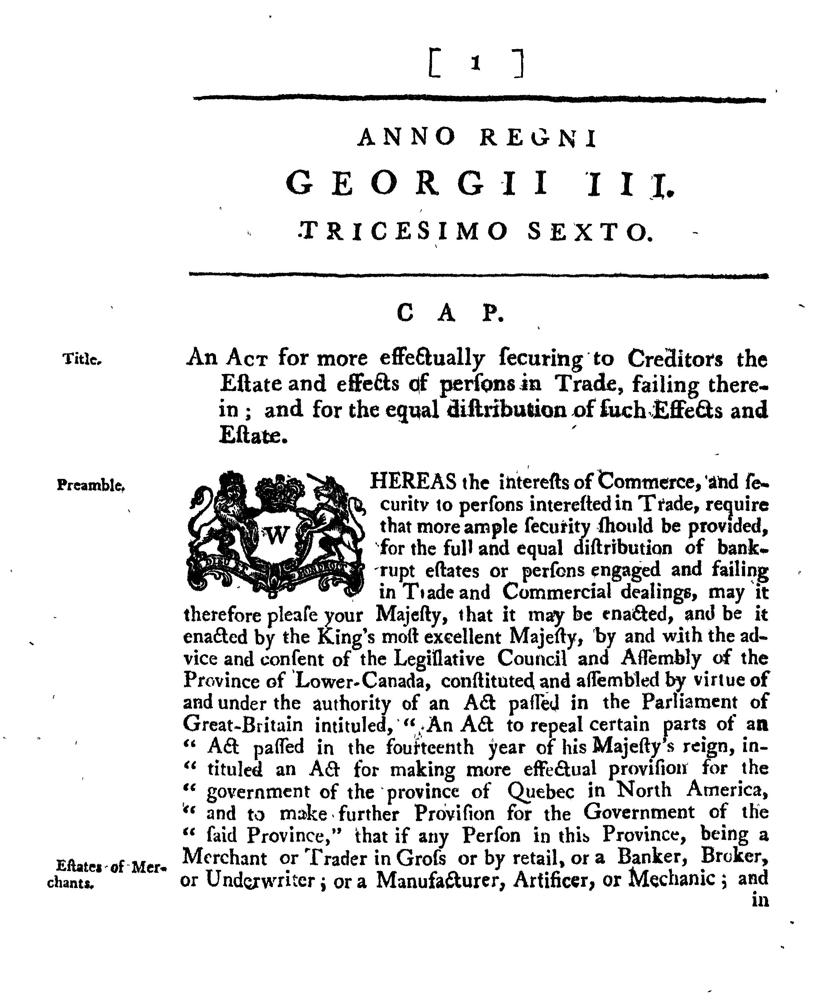 A bill offered by Mr. Chief Justice Monk of Montreal, on Monday, 23d November, 1795, to the Legislative Council : intituled " An act for more effectually securing to creditors the estate and effects of persons in trade failing therein, and for the equal distribution of such effects and estate".