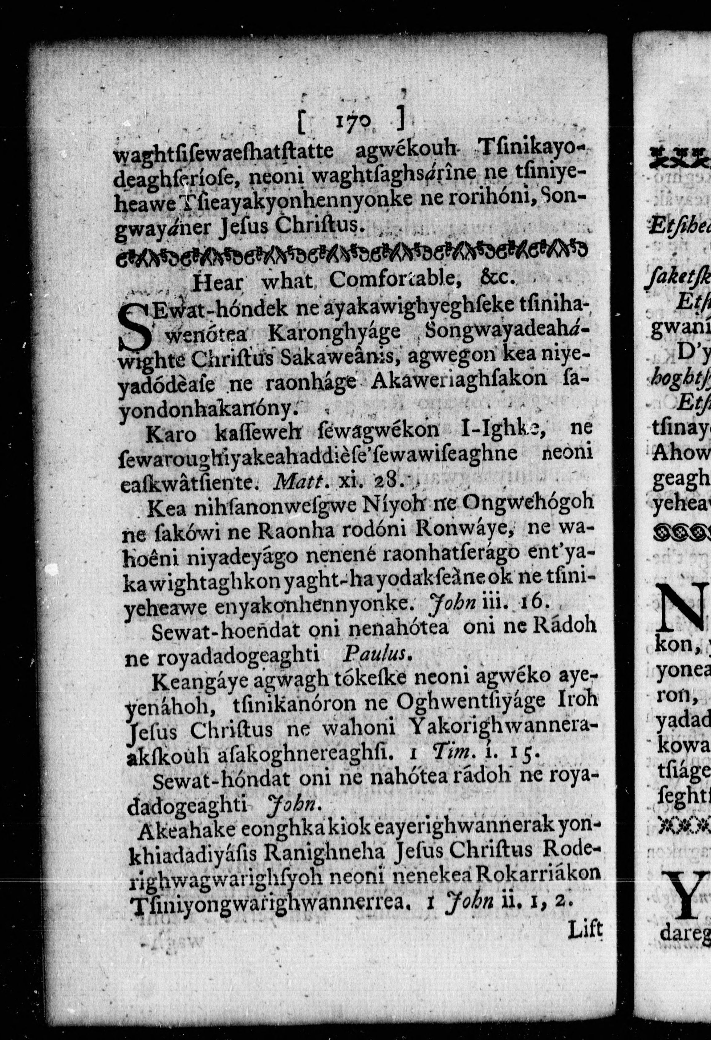 The order for morning and evening prayer, and administration of the sacraments, and some other offices of the Church of England : together with a collection of prayers, and some sentences of the Holy Scriptures, necessary for knowledge and practice = Ne yakawea Niyadewighniserage Yondereanayendakhkwa Orhoenké ne, neoni Yogarask-ha Oghseragwégouh ..