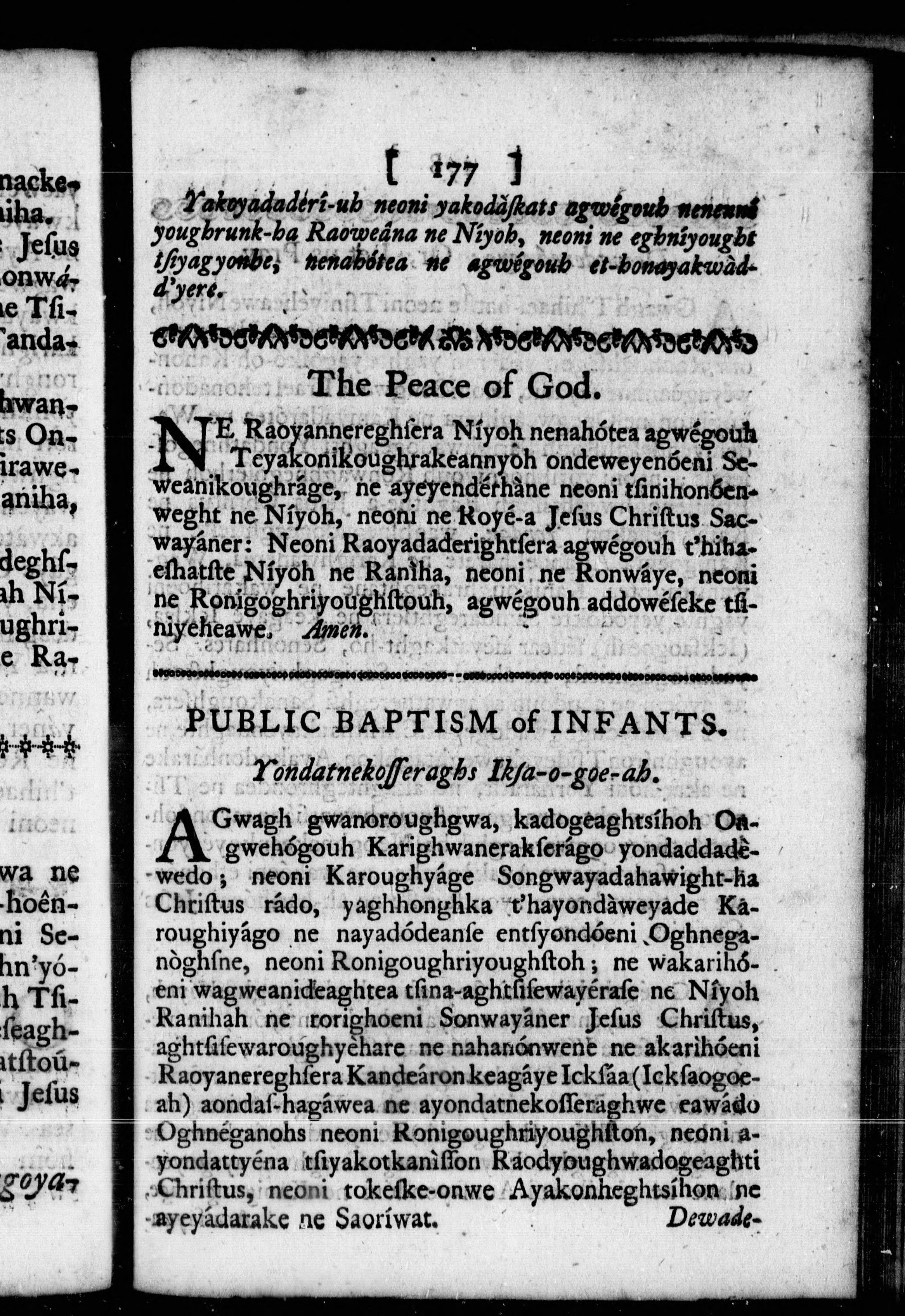 The order for morning and evening prayer, and administration of the sacraments, and some other offices of the Church of England : together with a collection of prayers, and some sentences of the Holy Scriptures, necessary for knowledge and practice = Ne yakawea Niyadewighniserage Yondereanayendakhkwa Orhoenké ne, neoni Yogarask-ha Oghseragwégouh ..